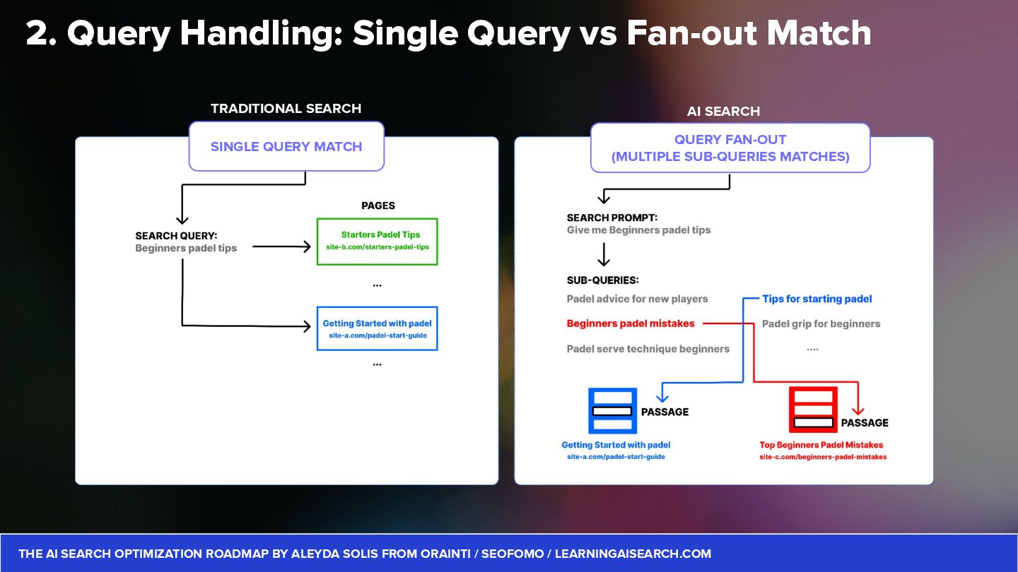 / SEOFOMO / LEARNINGAISEARCH.COM 2. Query Handling: Single Query vs Fan-out Match SINGLE QUERY MATCH TRADITIONAL SEARCH AI SEARCH QUERY FAN-OUT (MULTIPLE SUB-QUERIES MATCHES)