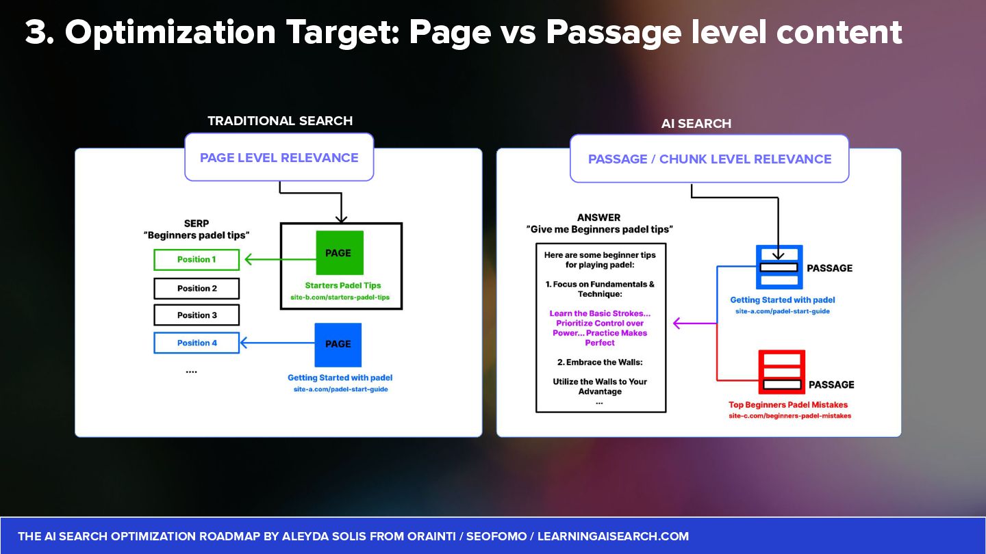 / SEOFOMO / LEARNINGAISEARCH.COM 3. Optimization Target: Page vs Passage level content PAGE LEVEL RELEVANCE TRADITIONAL SEARCH PASSAGE / CHUNK LEVEL RELEVANCE AI SEARCH