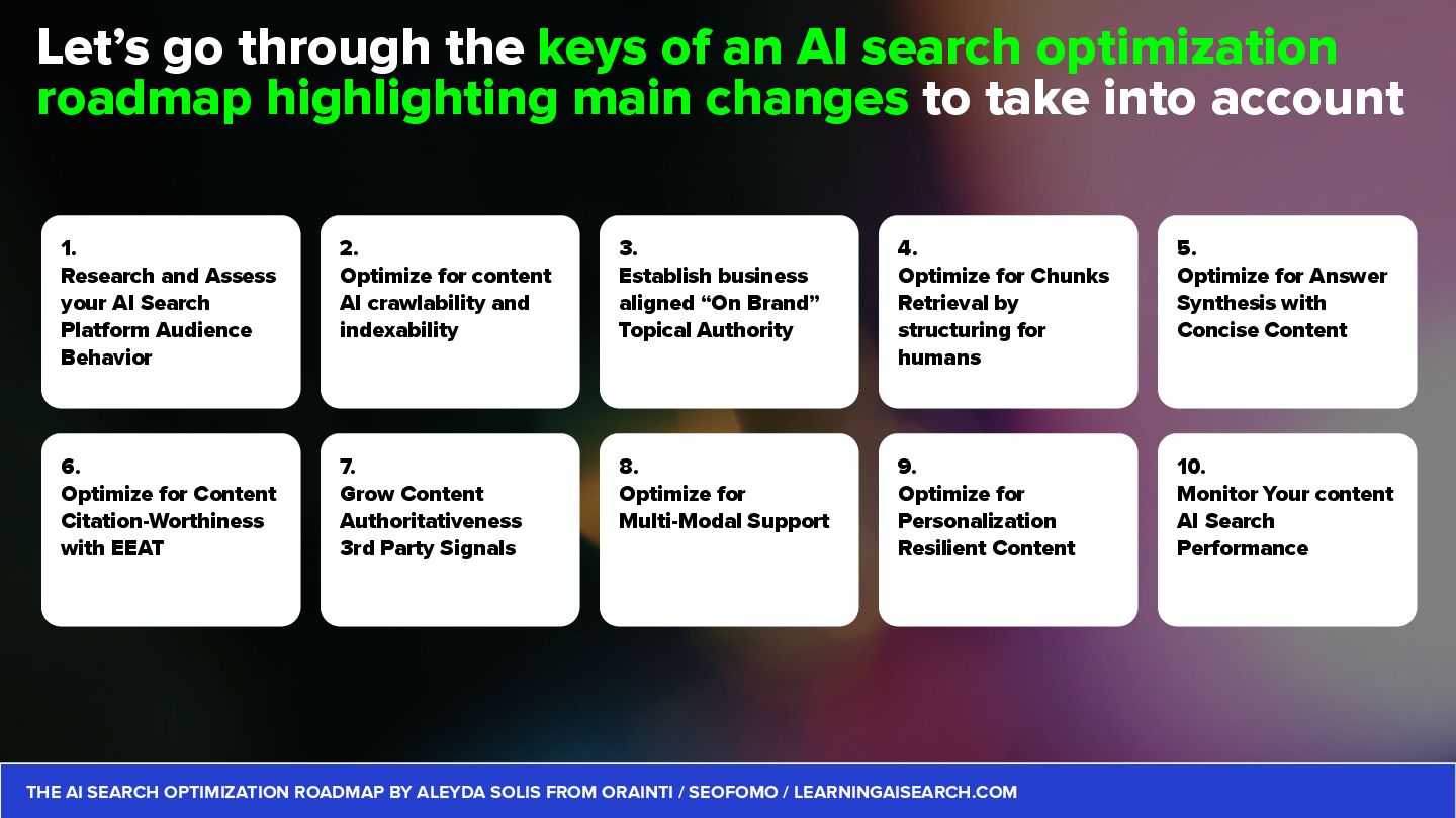 / SEOFOMO / LEARNINGAISEARCH.COM Let’s go through the keys of an AI search optimization roadmap highlighting main changes to take into account 1. Research and Assess your AI Search Platform Audience Behavior 2. Optimize for content AI crawlability and indexability 3. Establish business aligned “On Brand” Topical Authority 4. Optimize for Chunks Retrieval by structuring for humans 5. Optimize for Answer Synthesis with Concise Content 6. Optimize for Content Citation-Worthiness with EEAT 7. Grow Content Authoritativeness 3rd Party Signals 8. Optimize for Multi-Modal Support 9. Optimize for Personalization Resilient Content 10. Monitor Your content AI Search Performance