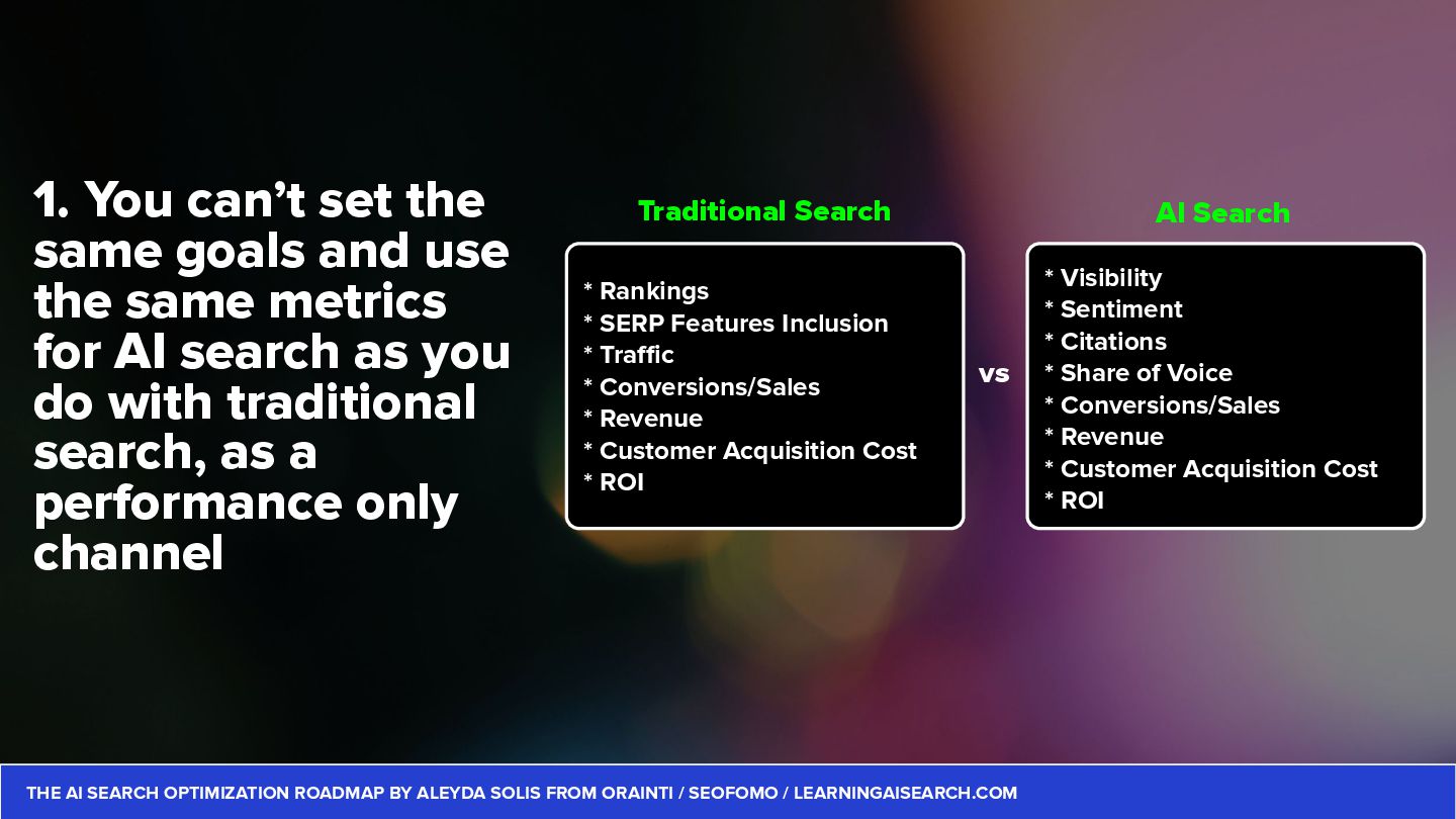 SEOFOMO / LEARNINGAISEARCH.COM THE AI SEARCH OPTIMIZATION ROADMAP BY ALEYDA SOLIS FROM ORAINTI / SEOFOMO / LEARNINGAISEARCH.COM 1. You can’t set the same goals and use the same metrics for AI search as you do with traditional search, as a performance only channel * Rankings * SERP Features Inclusion * Traffic * Conversions/Sales * Revenue * Customer Acquisition Cost * ROI * Visibility * Sentiment * Citations * Share of Voice * Conversions/Sales * Revenue * Customer Acquisition Cost * ROI vs Traditional Search AI Search