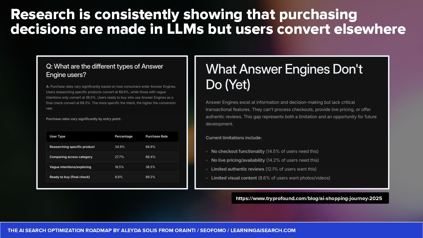 SEOFOMO / LEARNINGAISEARCH.COM THE AI SEARCH OPTIMIZATION ROADMAP BY ALEYDA SOLIS FROM ORAINTI / SEOFOMO / LEARNINGAISEARCH.COM https://www.tryprofound.com/blog/ai-shopping-journey-2025 Research is consistently showing that purchasing decisions are made in LLMs but users convert elsewhere