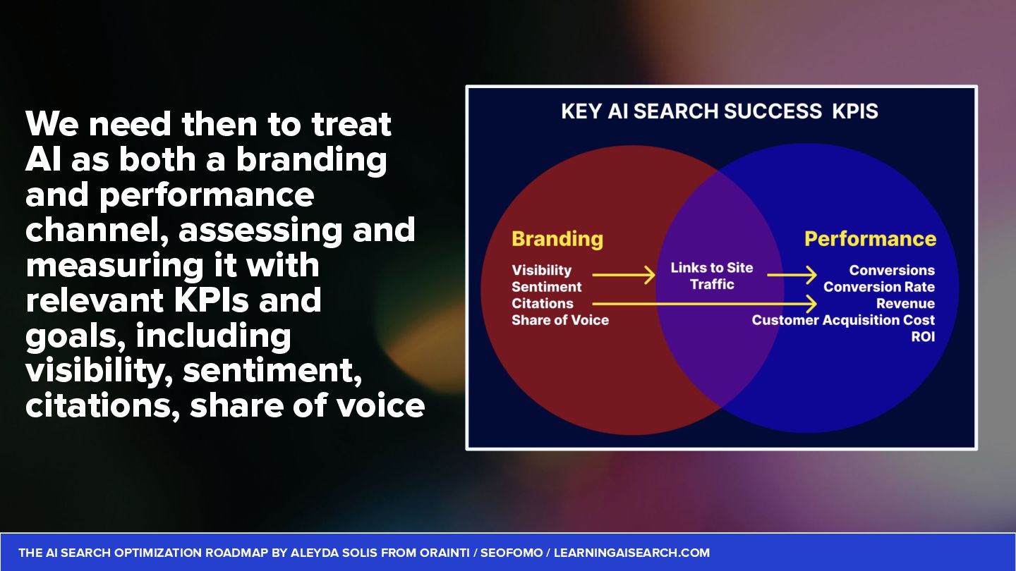 SEOFOMO / LEARNINGAISEARCH.COM THE AI SEARCH OPTIMIZATION ROADMAP BY ALEYDA SOLIS FROM ORAINTI / SEOFOMO / LEARNINGAISEARCH.COM We need then to treat AI as both a branding and performance channel, assessing and measuring it with relevant KPIs and goals, including visibility, sentiment, citations, share of voice