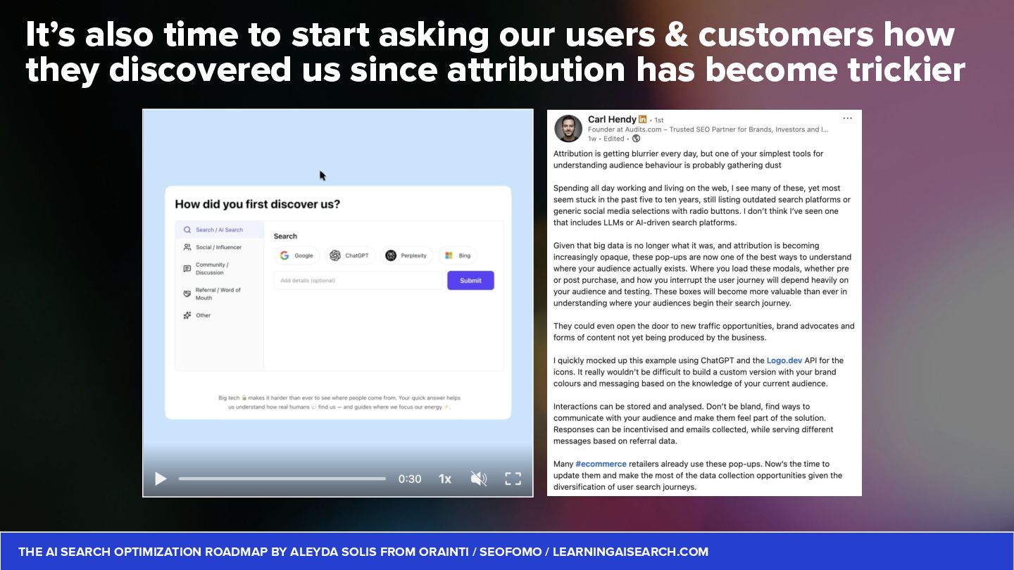 SEOFOMO / LEARNINGAISEARCH.COM THE AI SEARCH OPTIMIZATION ROADMAP BY ALEYDA SOLIS FROM ORAINTI / SEOFOMO / LEARNINGAISEARCH.COM It’s also time to start asking our users & customers how they discovered us since attribution has become trickier