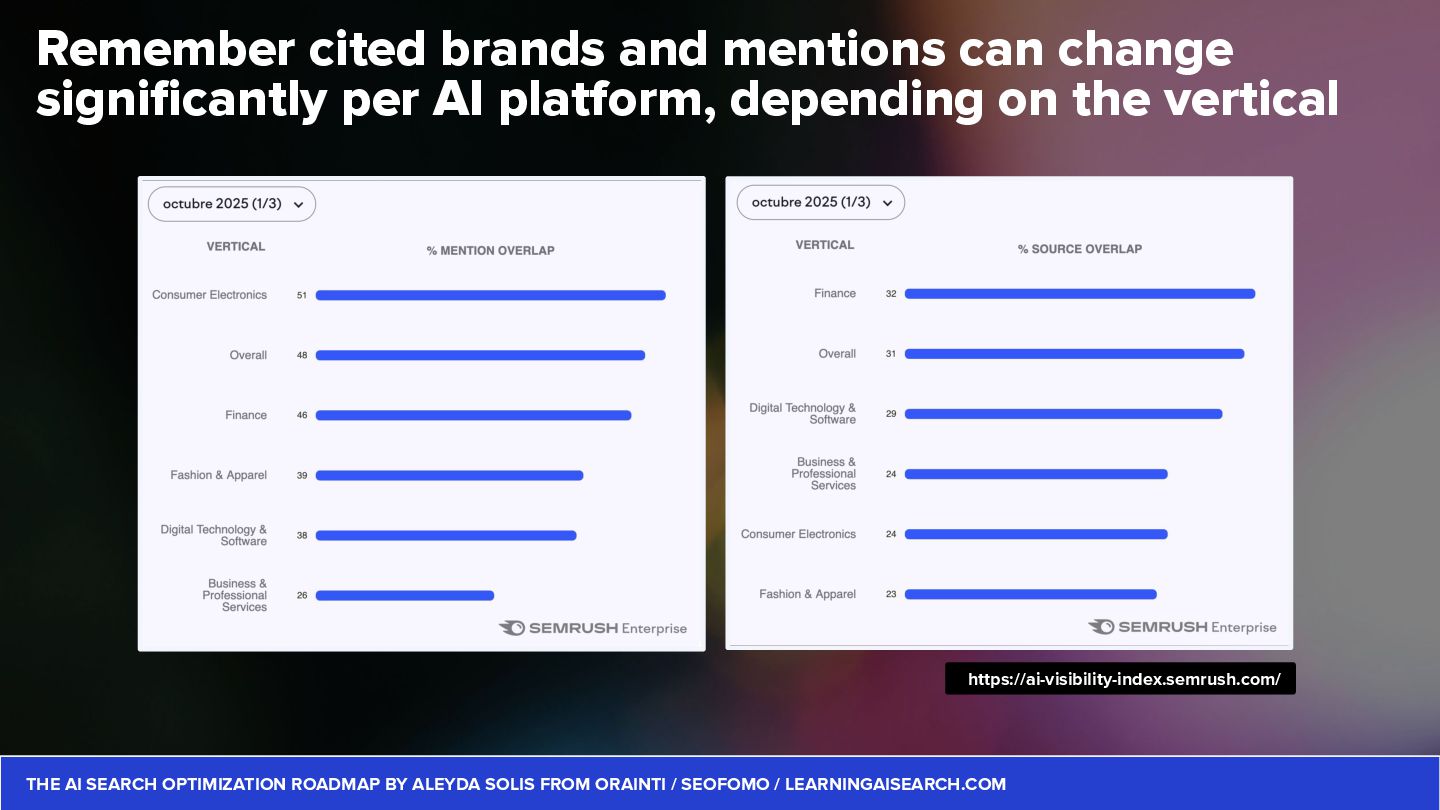 / SEOFOMO / LEARNINGAISEARCH.COM THE AI SEARCH OPTIMIZATION ROADMAP BY ALEYDA SOLIS FROM ORAINTI / SEOFOMO / LEARNINGAISEARCH.COM Remember cited brands and mentions can change significantly per AI platform, depending on the vertical