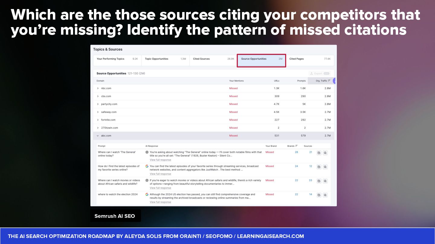 SEOFOMO / LEARNINGAISEARCH.COM THE AI SEARCH OPTIMIZATION ROADMAP BY ALEYDA SOLIS FROM ORAINTI / SEOFOMO / LEARNINGAISEARCH.COM Which are the those sources citing your competitors that you’re missing? Identify the pattern of missed citations Semrush AI SEO