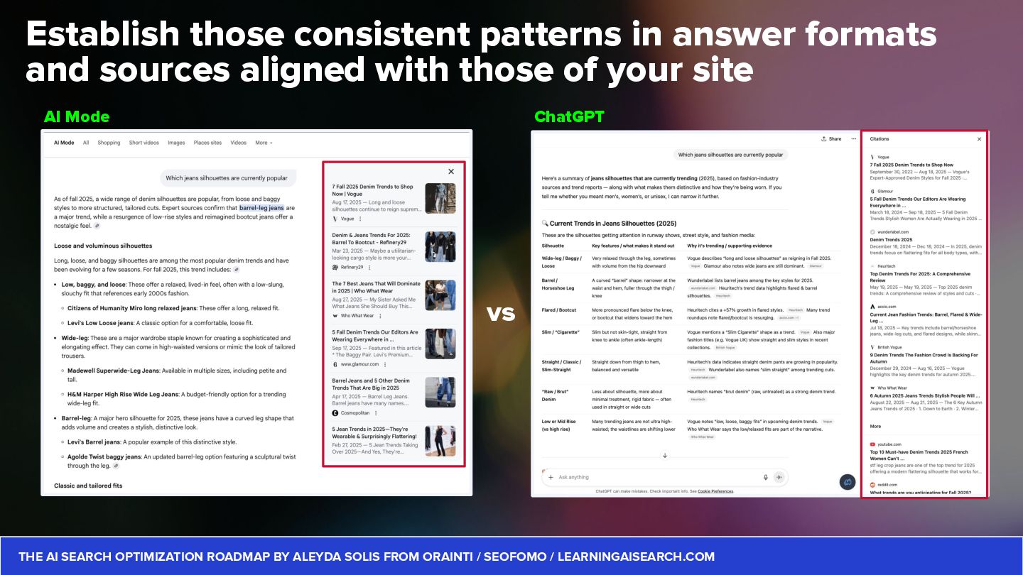 SEOFOMO / LEARNINGAISEARCH.COM THE AI SEARCH OPTIMIZATION ROADMAP BY ALEYDA SOLIS FROM ORAINTI / SEOFOMO / LEARNINGAISEARCH.COM Establish those consistent patterns in answer formats and sources aligned with those of your site vs AI Mode ChatGPT