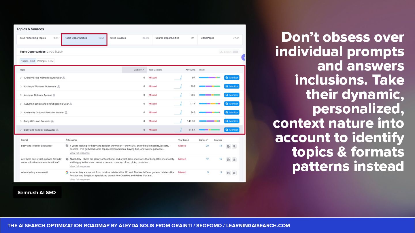 dynamic, personalized, context nature into account to identify topics & formats patterns instead Semrush AI SEO THE AI SEARCH OPTIMIZATION ROADMAP BY ALEYDA SOLIS FROM ORAINTI / SEOFOMO / LEARNINGAISEARCH.COM