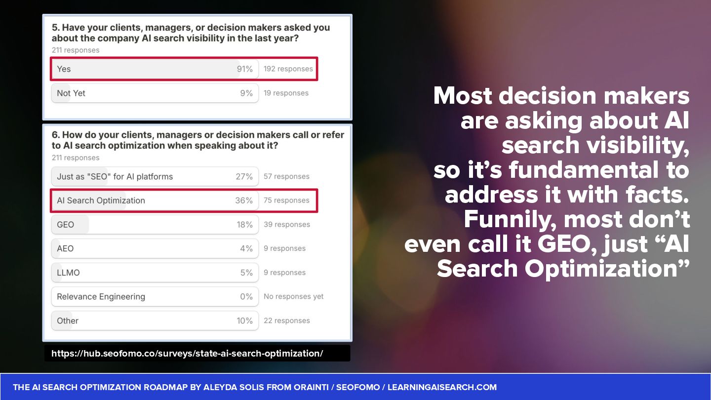 / SEOFOMO / LEARNINGAISEARCH.COM Most decision makers are asking about AI search visibility, so it’s fundamental to address it with facts. Funnily, most don’t even call it GEO, just “AI Search Optimization” https://hub.seofomo.co/surveys/state-ai-search-optimization/
