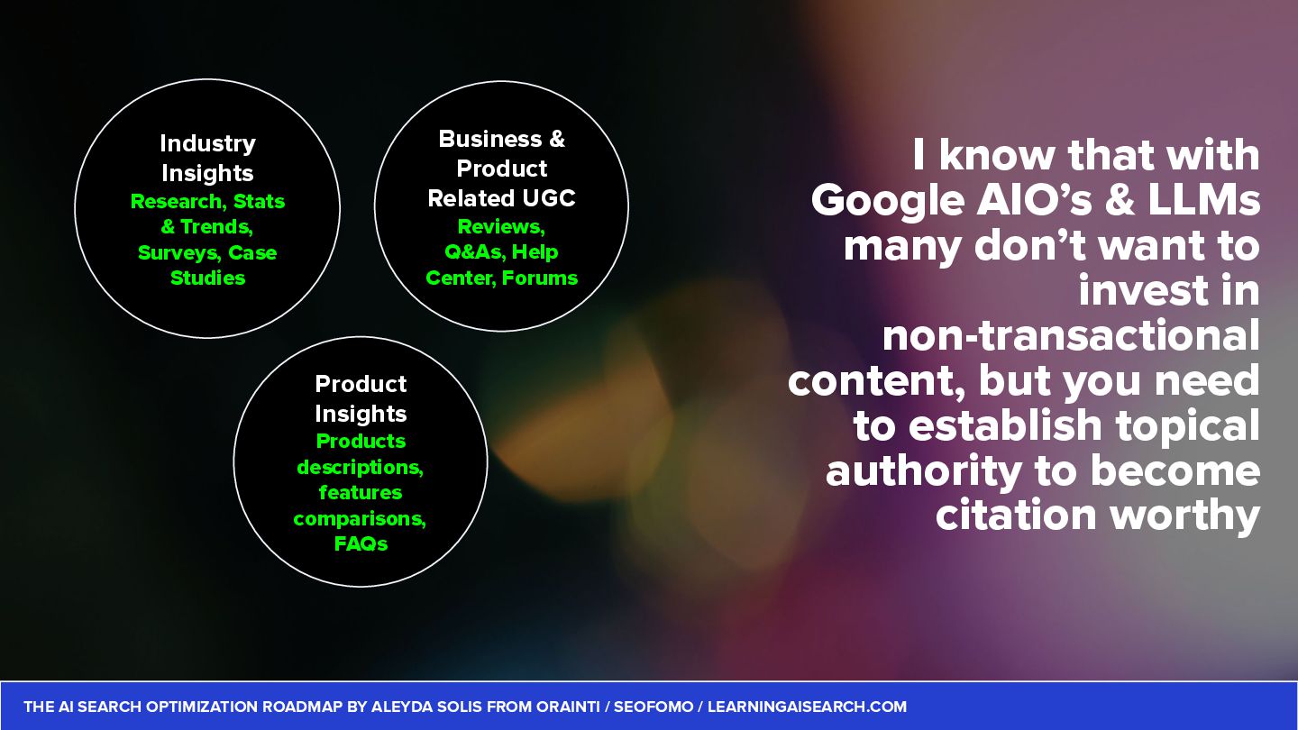 Insights Products descriptions, features comparisons, FAQs Business & Product Related UGC Reviews, Q&As, Help Center, Forums WINNING ECOMMERCE AI SEARCH BY ALEYDA SOLIS FROM ORAINTI / SEOFOMO / LEARNINGAISEARCH.COM THE AI SEARCH OPTIMIZATION ROADMAP BY ALEYDA SOLIS FROM ORAINTI / SEOFOMO / LEARNINGAISEARCH.COM I know that with Google AIO’s & LLMs many don’t want to invest in non-transactional content, but you need to establish topical authority to become citation worthy