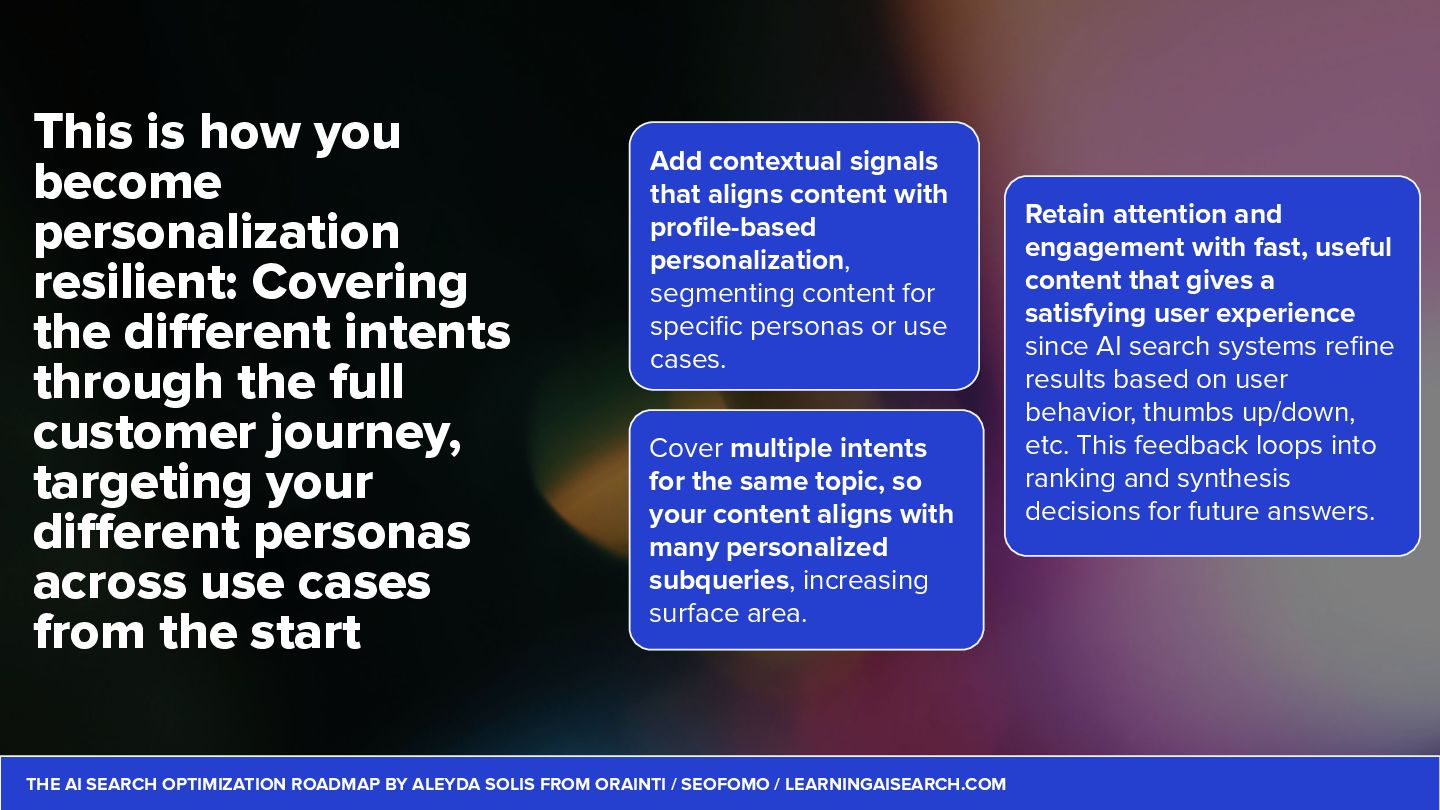 SEOFOMO / LEARNINGAISEARCH.COM THE AI SEARCH OPTIMIZATION ROADMAP BY ALEYDA SOLIS FROM ORAINTI / SEOFOMO / LEARNINGAISEARCH.COM Cover multiple intents for the same topic, so your content aligns with many personalized subqueries, increasing surface area. Add contextual signals that aligns content with profile-based personalization, segmenting content for specific personas or use cases. Retain attention and engagement with fast, useful content that gives a satisfying user experience since AI search systems refine results based on user behavior, thumbs up/down, etc. This feedback loops into ranking and synthesis decisions for future answers. This is how you become personalization resilient: Covering the different intents through the full customer journey, targeting your different personas across use cases from the start