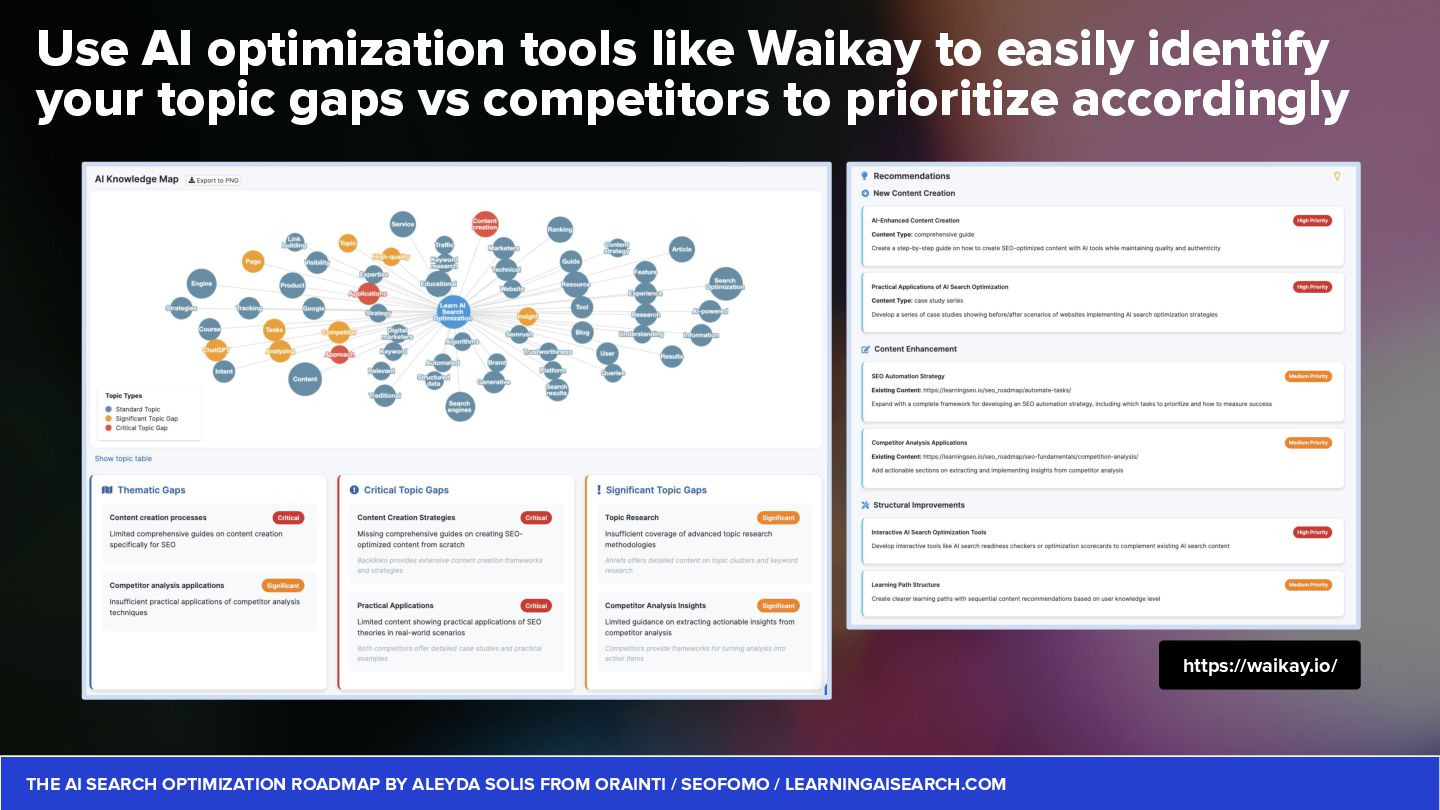 your topic gaps vs competitors to prioritize accordingly WINNING ECOMMERCE AI SEARCH BY ALEYDA SOLIS FROM ORAINTI / SEOFOMO / LEARNINGAISEARCH.COM THE AI SEARCH OPTIMIZATION ROADMAP BY ALEYDA SOLIS FROM ORAINTI / SEOFOMO / LEARNINGAISEARCH.COM