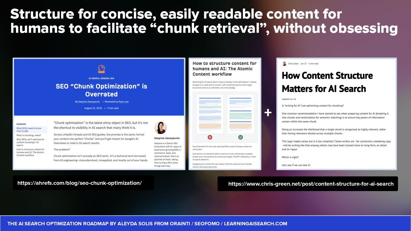 / SEOFOMO / LEARNINGAISEARCH.COM https://ahrefs.com/blog/seo-chunk-optimization/ https://www.chris-green.net/post/content-structure-for-ai-search Structure for concise, easily readable content for humans to facilitate “chunk retrieval”, without obsessing +
