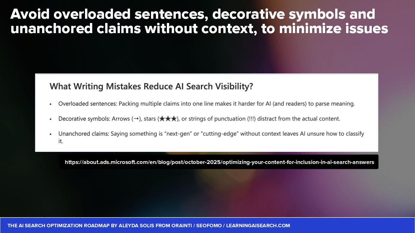 SEOFOMO / LEARNINGAISEARCH.COM THE AI SEARCH OPTIMIZATION ROADMAP BY ALEYDA SOLIS FROM ORAINTI / SEOFOMO / LEARNINGAISEARCH.COM https://about.ads.microsoft.com/en/blog/post/october-2025/optimizing-your-content-for-inclusion-in-ai-search-answers Avoid overloaded sentences, decorative symbols and unanchored claims without context, to minimize issues