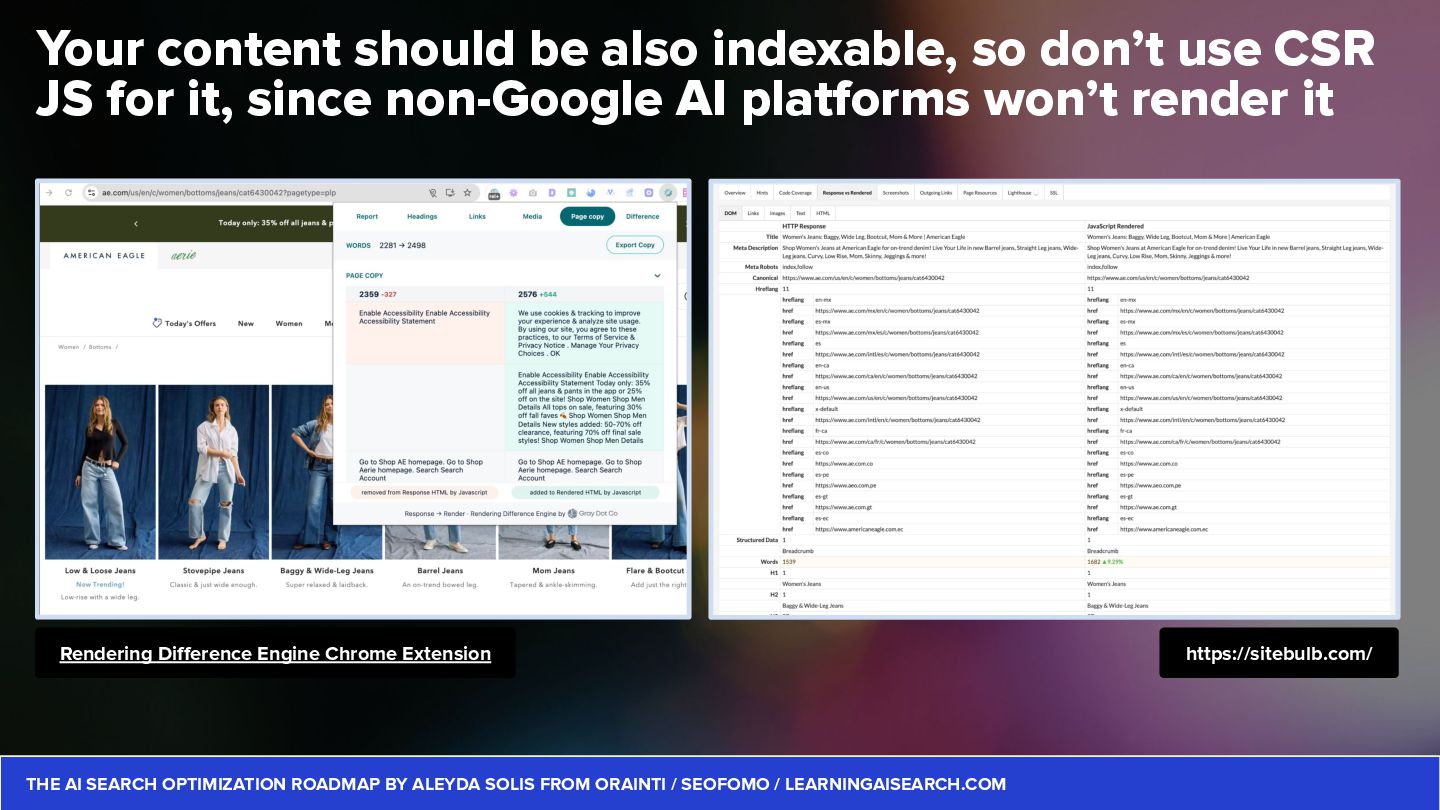 also indexable, so don’t use CSR JS for it, since non-Google AI platforms won’t render it WINNING ECOMMERCE AI SEARCH BY ALEYDA SOLIS FROM ORAINTI / SEOFOMO / LEARNINGAISEARCH.COM THE AI SEARCH OPTIMIZATION ROADMAP BY ALEYDA SOLIS FROM ORAINTI / SEOFOMO / LEARNINGAISEARCH.COM