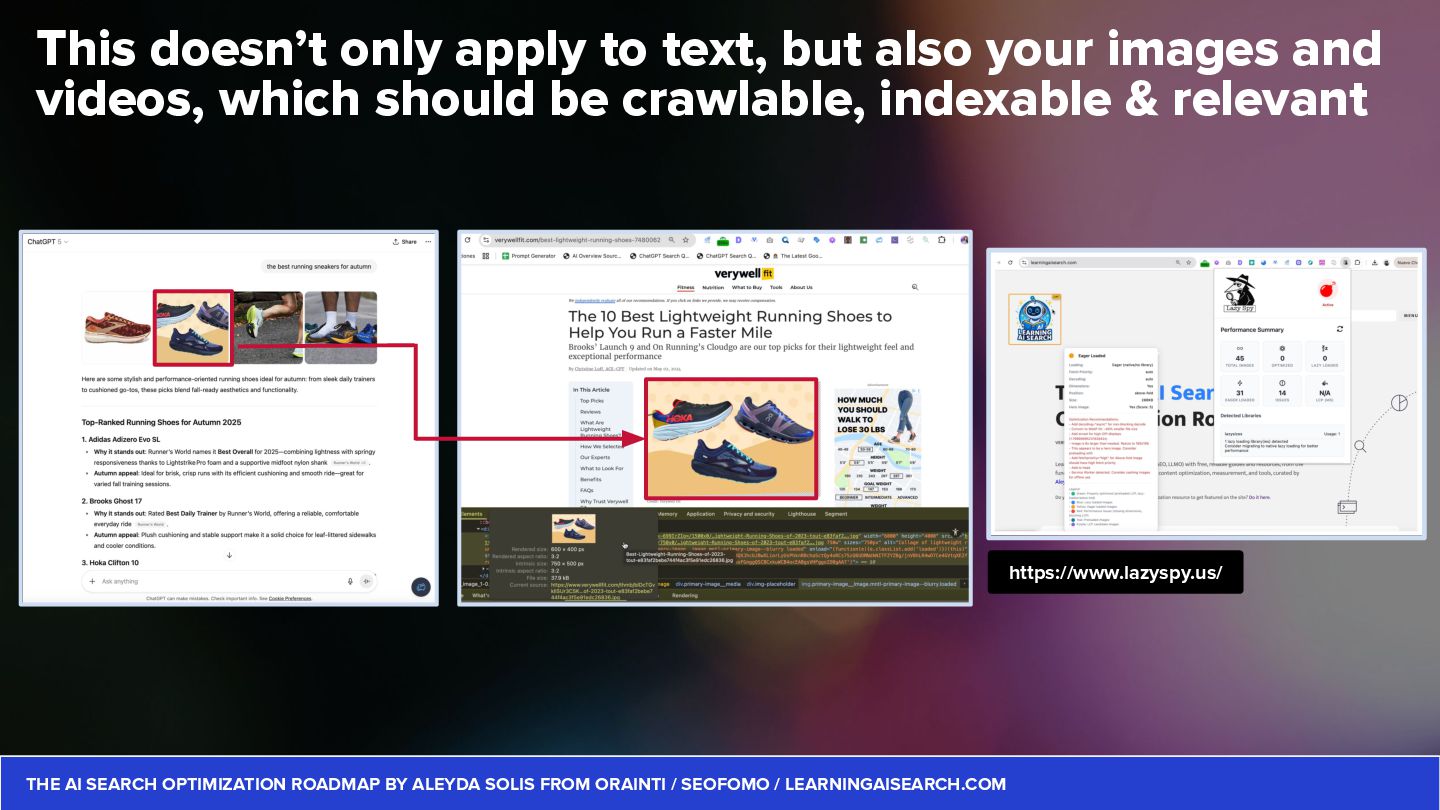 images and videos, which should be crawlable, indexable & relevant WINNING ECOMMERCE AI SEARCH BY ALEYDA SOLIS FROM ORAINTI / SEOFOMO / LEARNINGAISEARCH.COM THE AI SEARCH OPTIMIZATION ROADMAP BY ALEYDA SOLIS FROM ORAINTI / SEOFOMO / LEARNINGAISEARCH.COM