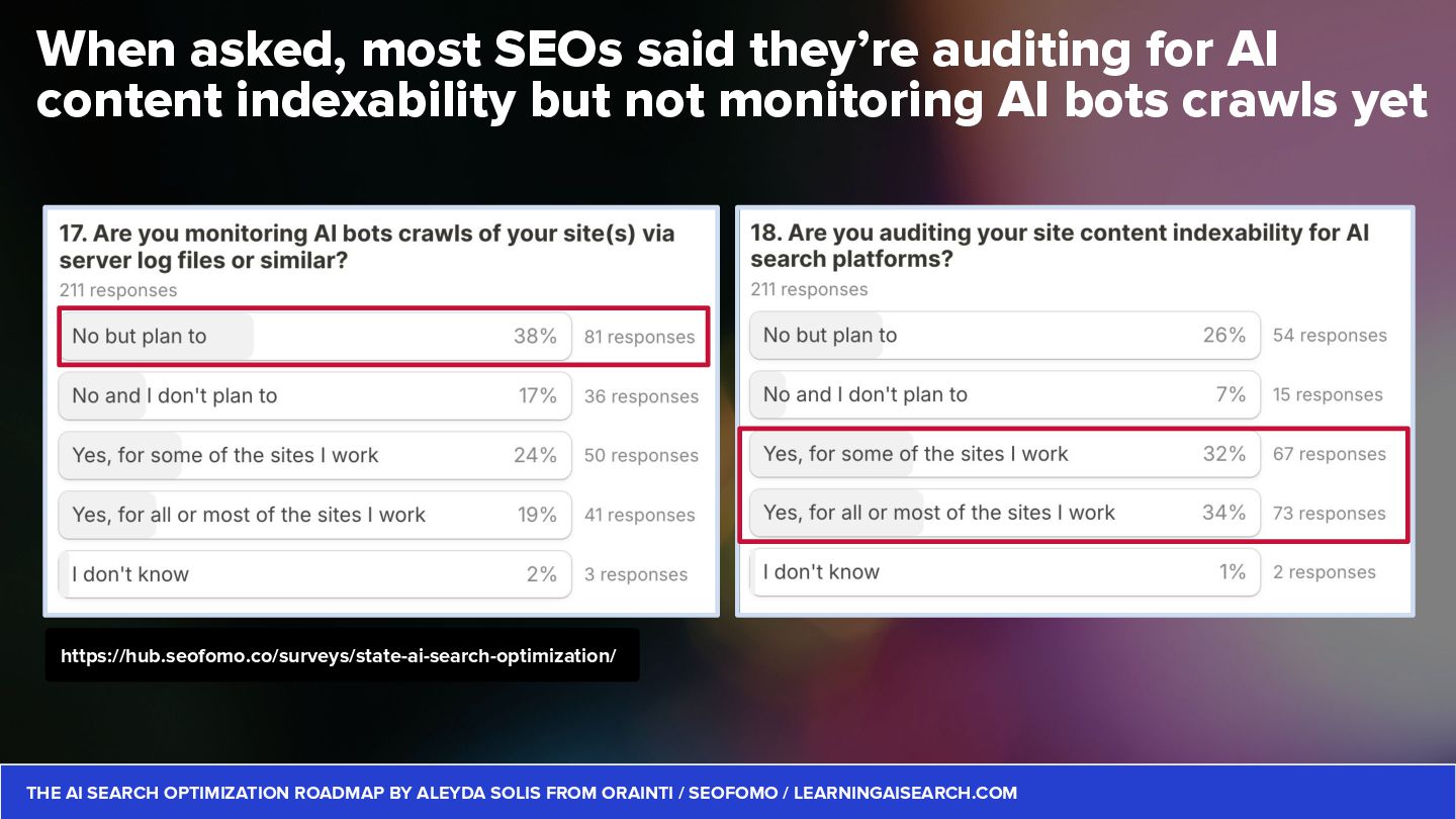 / SEOFOMO / LEARNINGAISEARCH.COM https://hub.seofomo.co/surveys/state-ai-search-optimization/ When asked, most SEOs said they’re auditing for AI content indexability but not monitoring AI bots crawls yet