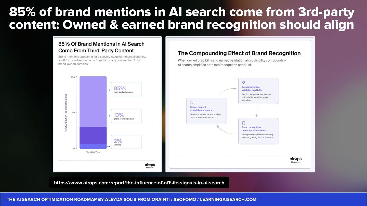 / SEOFOMO / LEARNINGAISEARCH.COM THE AI SEARCH OPTIMIZATION ROADMAP BY ALEYDA SOLIS FROM ORAINTI / SEOFOMO / LEARNINGAISEARCH.COM 85% of brand mentions in AI search come from 3rd-party content: Owned & earned brand recognition should align