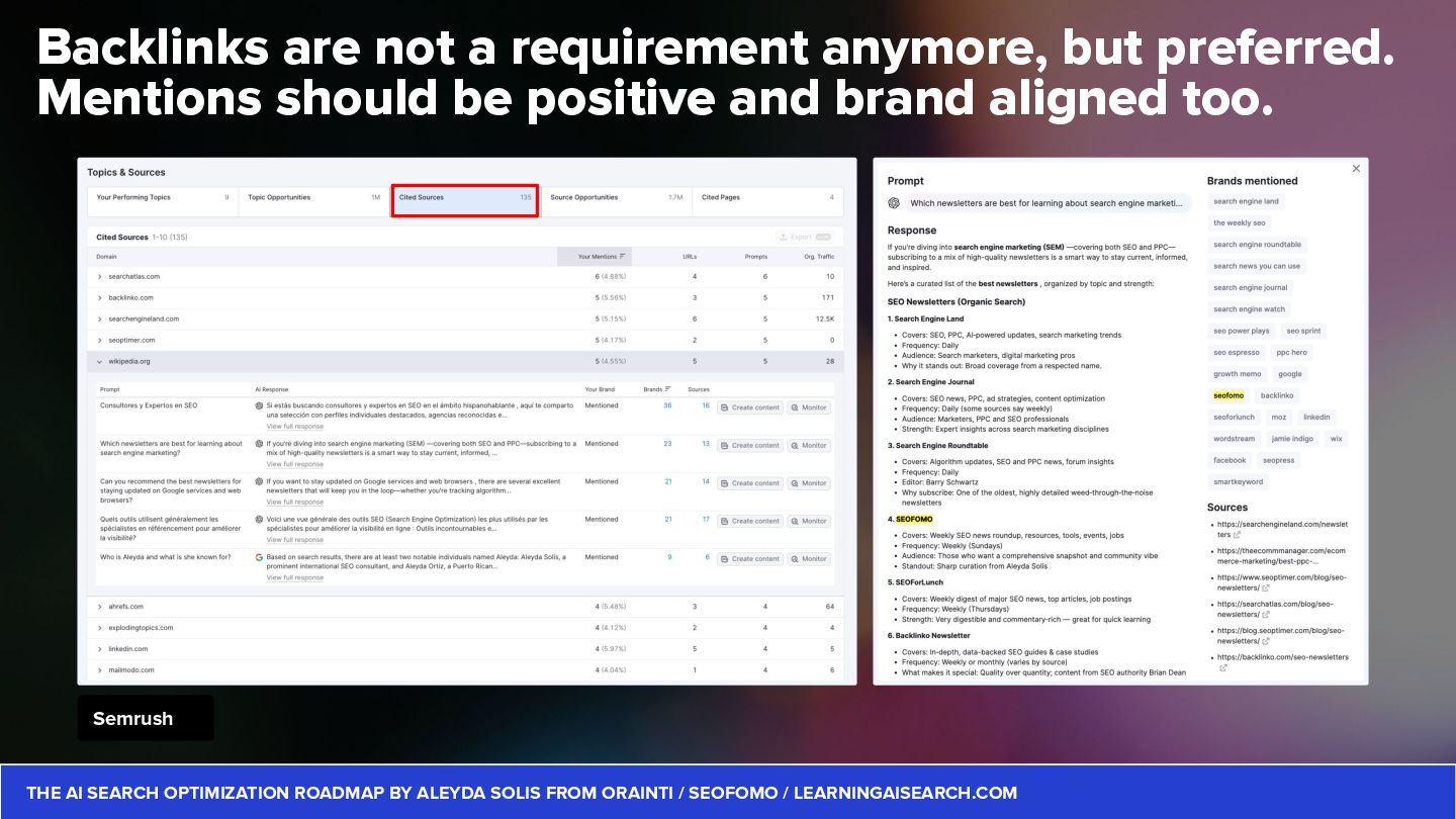 SEOFOMO / LEARNINGAISEARCH.COM THE AI SEARCH OPTIMIZATION ROADMAP BY ALEYDA SOLIS FROM ORAINTI / SEOFOMO / LEARNINGAISEARCH.COM Backlinks are not a requirement anymore, but preferred. Mentions should be positive and brand aligned too. Semrush
