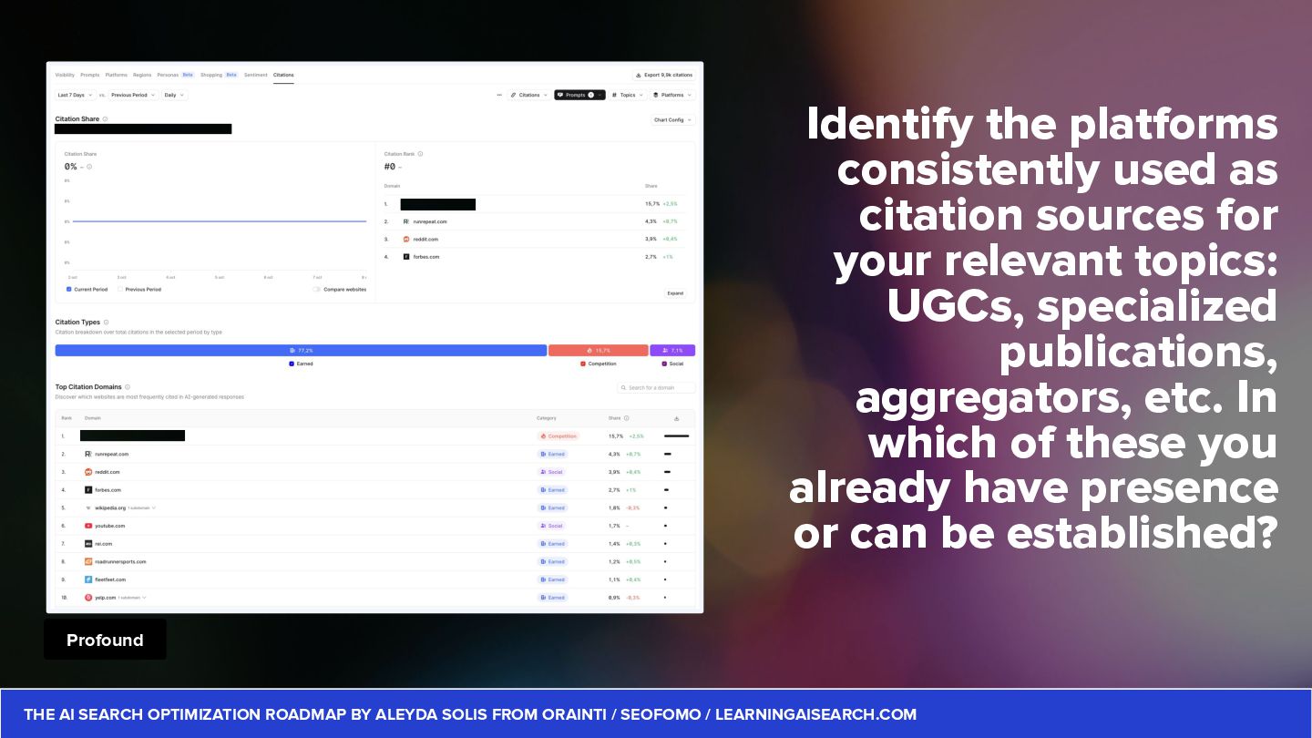 SEOFOMO / LEARNINGAISEARCH.COM Prioritize those topics for which there’s a higher share of answers consistently grounded, that can be influenced THE AI SEARCH OPTIMIZATION ROADMAP BY ALEYDA SOLIS FROM ORAINTI / SEOFOMO / LEARNINGAISEARCH.COM https://www.tryprofound.com/