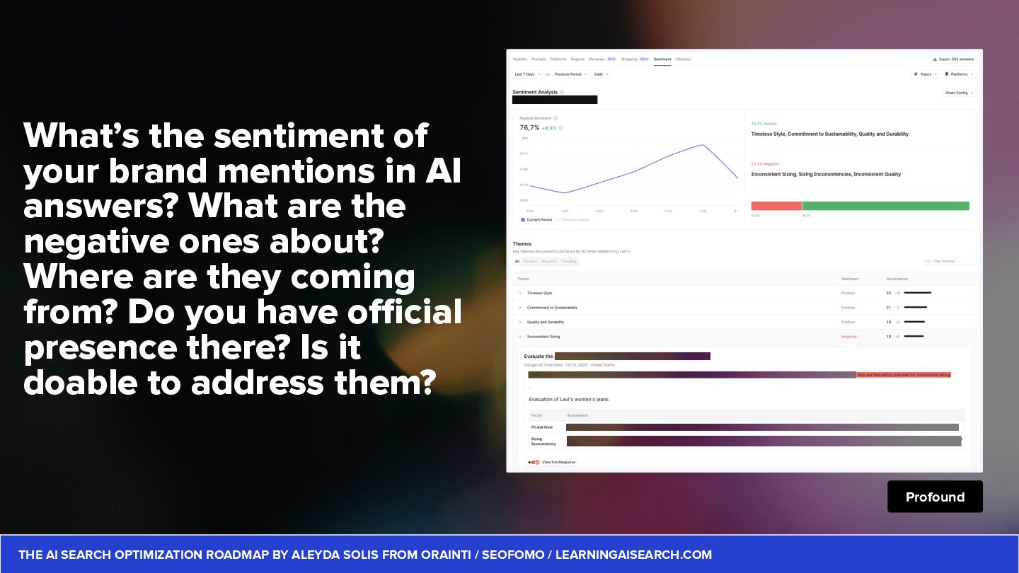 What are the negative ones about? Where are they coming from? Do you have official presence there? Is it doable to address them? WINNING ECOMMERCE AI SEARCH BY ALEYDA SOLIS FROM ORAINTI / SEOFOMO / LEARNINGAISEARCH.COM THE AI SEARCH OPTIMIZATION ROADMAP BY ALEYDA SOLIS FROM ORAINTI / SEOFOMO / LEARNINGAISEARCH.COM Profound