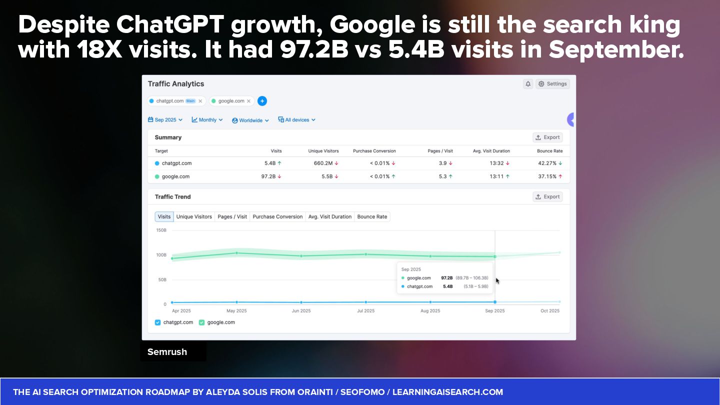 / SEOFOMO / LEARNINGAISEARCH.COM Despite ChatGPT growth, Google is still the search king with 18X visits. It had 97.2B vs 5.4B visits in September. Semrush