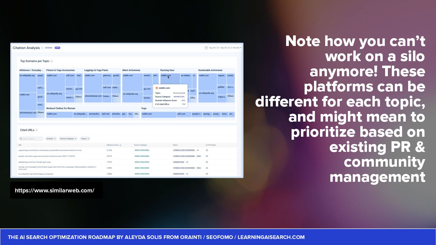 / SEOFOMO / LEARNINGAISEARCH.COM THE AI SEARCH OPTIMIZATION ROADMAP BY ALEYDA SOLIS FROM ORAINTI / SEOFOMO / LEARNINGAISEARCH.COM Note how you can’t work on a silo anymore! These platforms can be different for each topic, and might mean to prioritize based on existing PR & community management