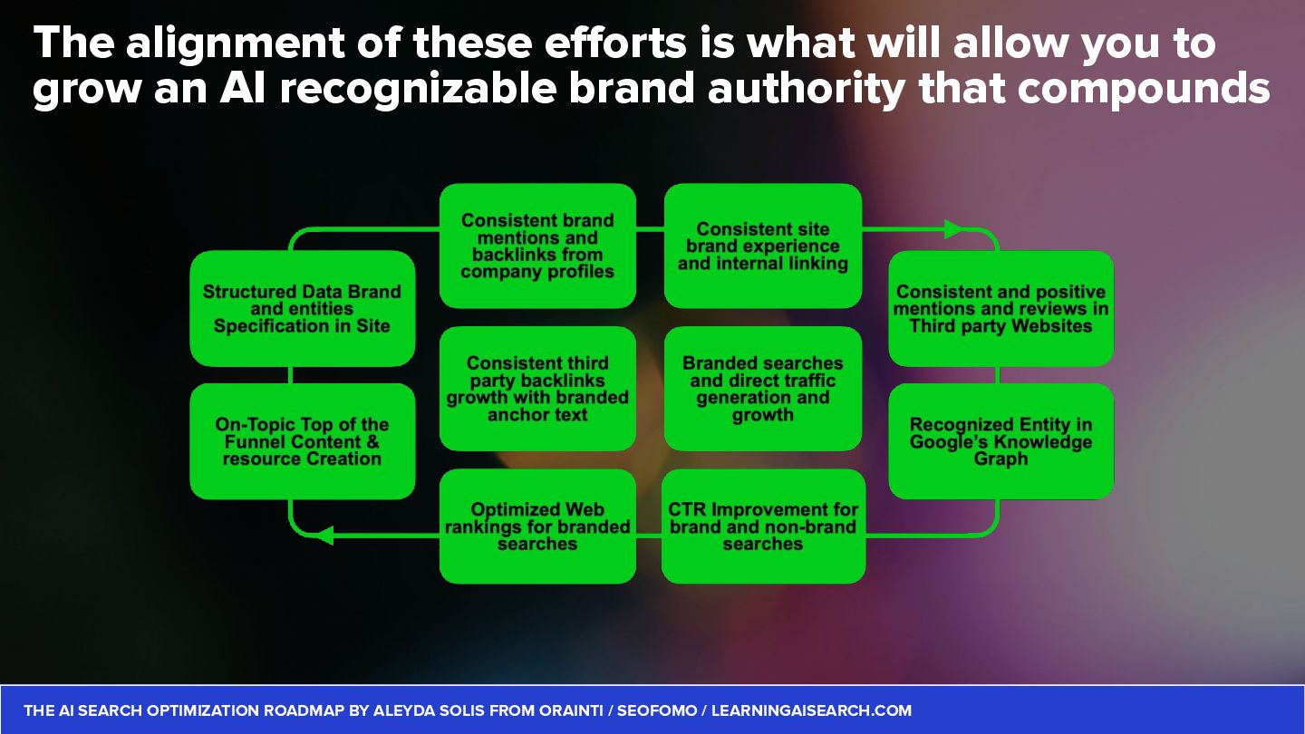 SEOFOMO / LEARNINGAISEARCH.COM THE AI SEARCH OPTIMIZATION ROADMAP BY ALEYDA SOLIS FROM ORAINTI / SEOFOMO / LEARNINGAISEARCH.COM The alignment of these efforts is what will allow you to grow an AI recognizable brand authority that compounds