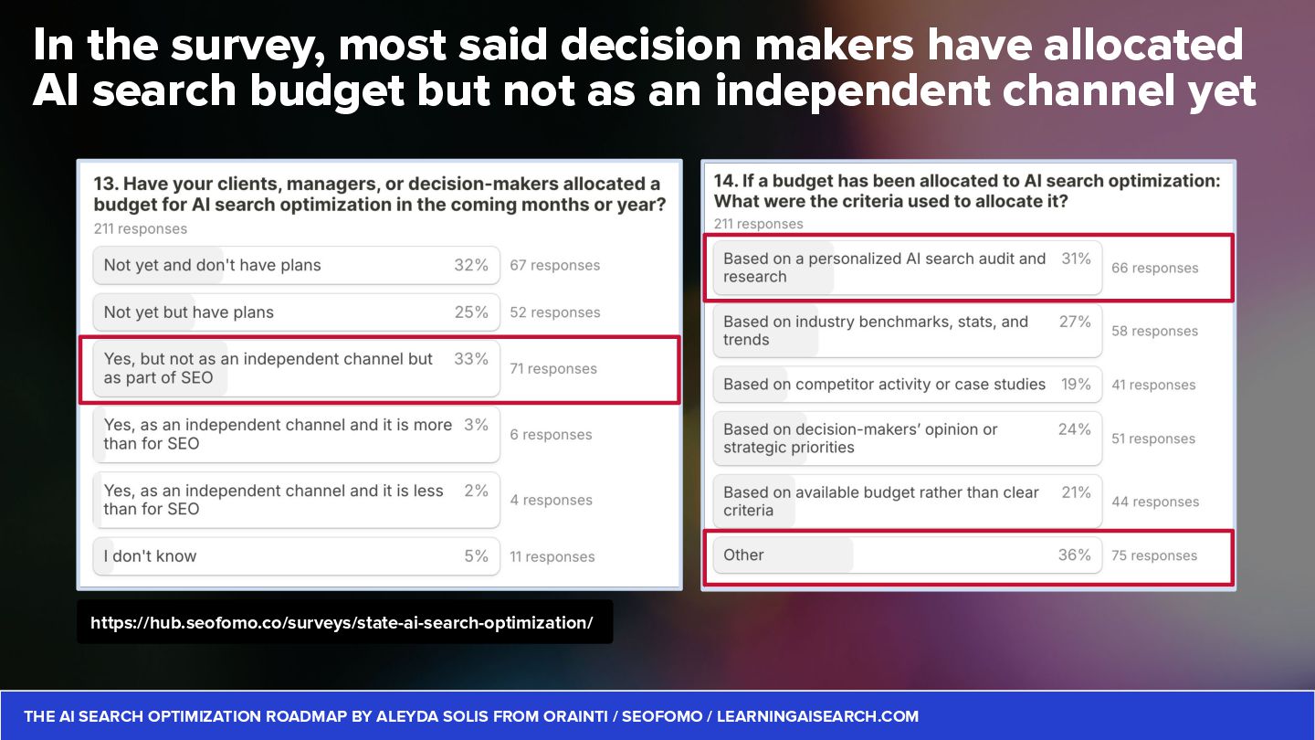 / SEOFOMO / LEARNINGAISEARCH.COM In the survey, most said decision makers have allocated AI search budget but not as an independent channel yet https://hub.seofomo.co/surveys/state-ai-search-optimization/