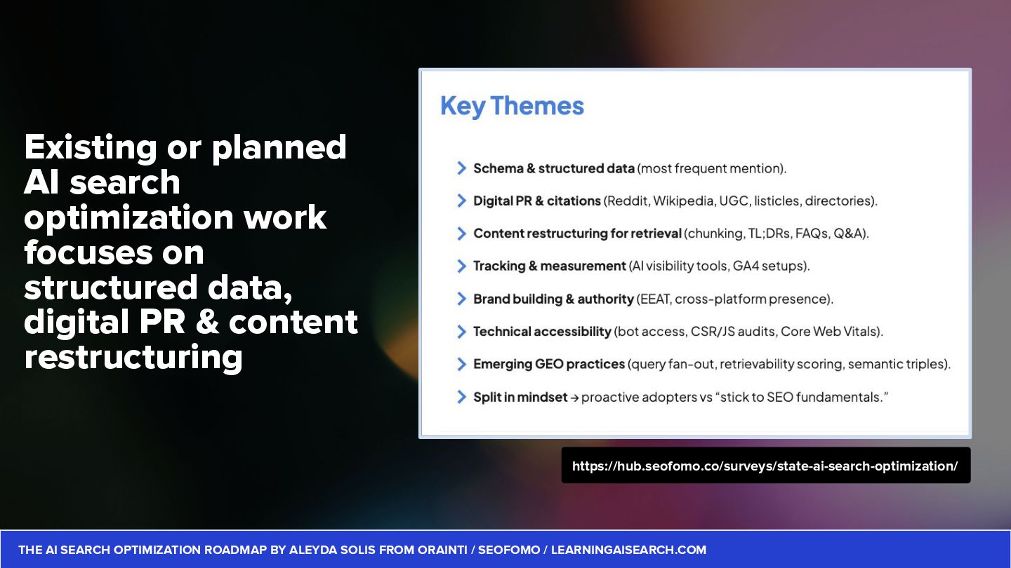 / SEOFOMO / LEARNINGAISEARCH.COM https://hub.seofomo.co/surveys/state-ai-search-optimization/ Existing or planned AI search optimization work focuses on structured data, digital PR & content restructuring