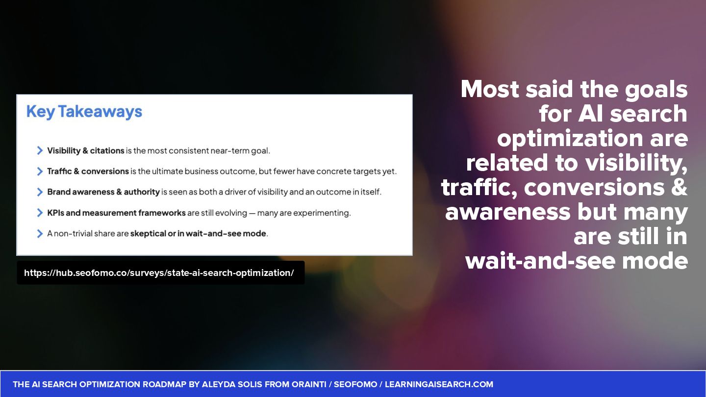 / SEOFOMO / LEARNINGAISEARCH.COM Most said the goals for AI search optimization are related to visibility, traffic, conversions & awareness but many are still in wait-and-see mode https://hub.seofomo.co/surveys/state-ai-search-optimization/
