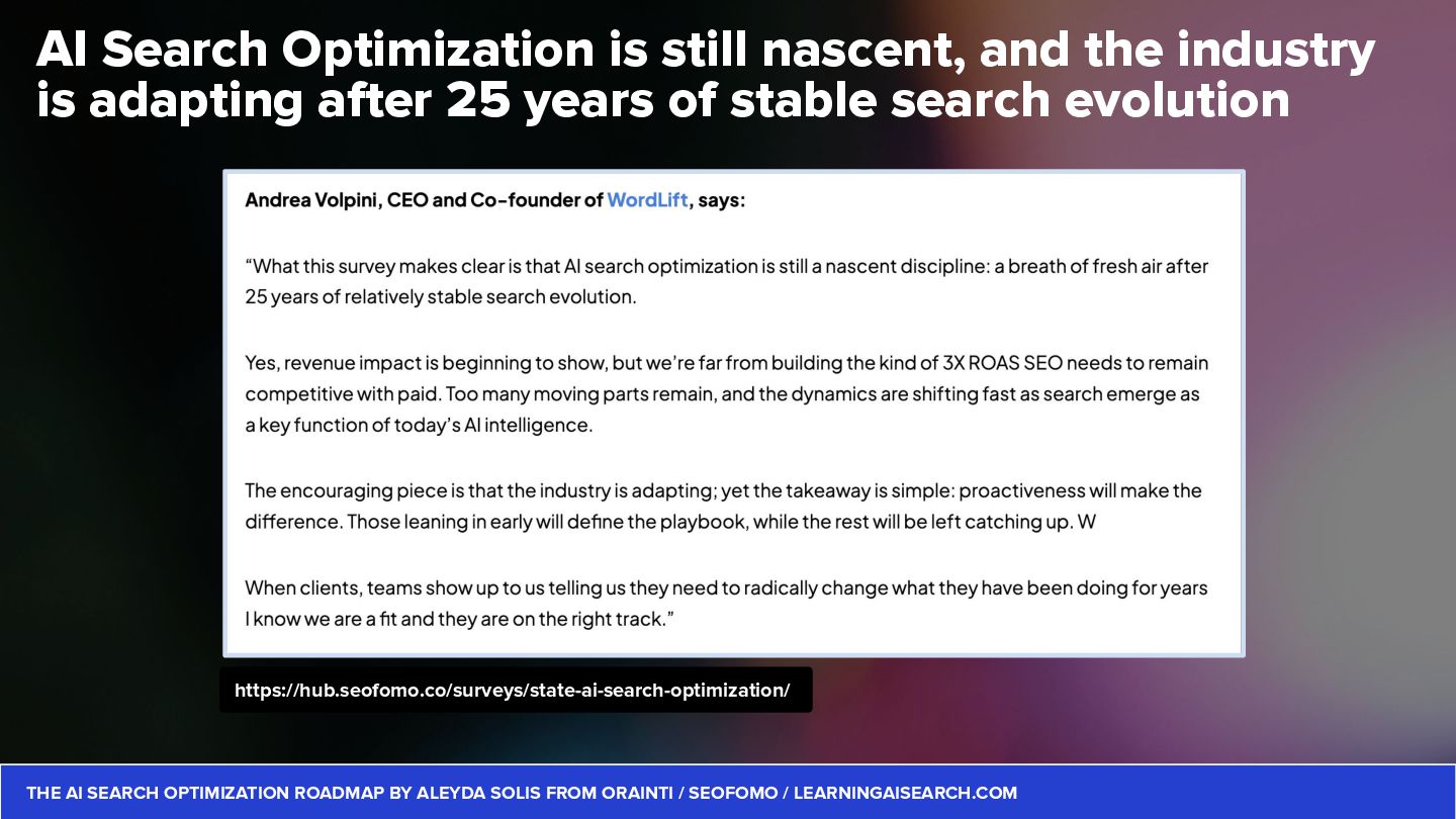 / SEOFOMO / LEARNINGAISEARCH.COM https://hub.seofomo.co/surveys/state-ai-search-optimization/ AI Search Optimization is still nascent, and the industry is adapting after 25 years of stable search evolution