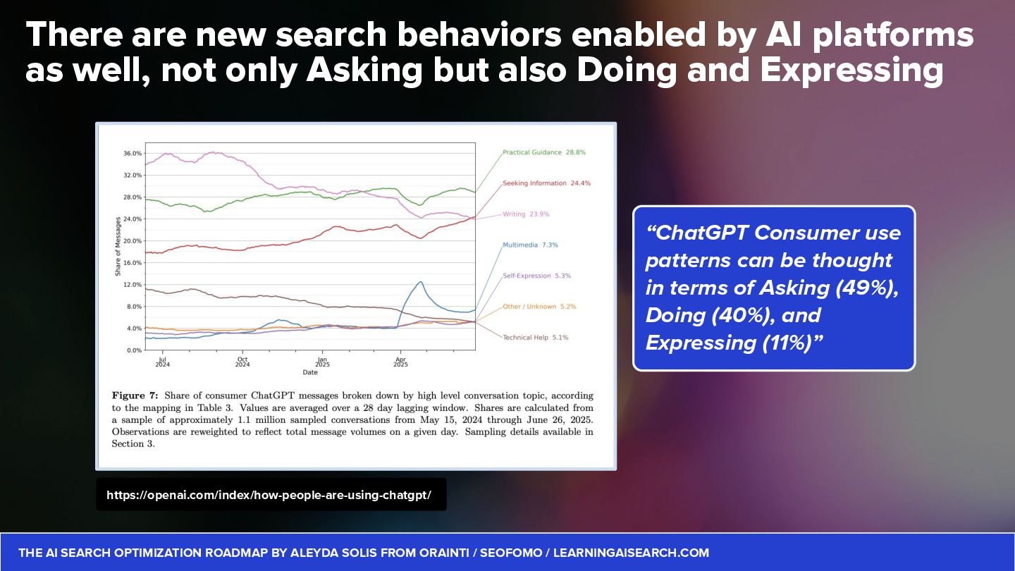 / SEOFOMO / LEARNINGAISEARCH.COM https://openai.com/index/how-people-are-using-chatgpt/ “ChatGPT Consumer use patterns can be thought in terms of Asking (49%), Doing (40%), and Expressing (11%)” There are new search behaviors enabled by AI platforms as well, not only Asking but also Doing and Expressing