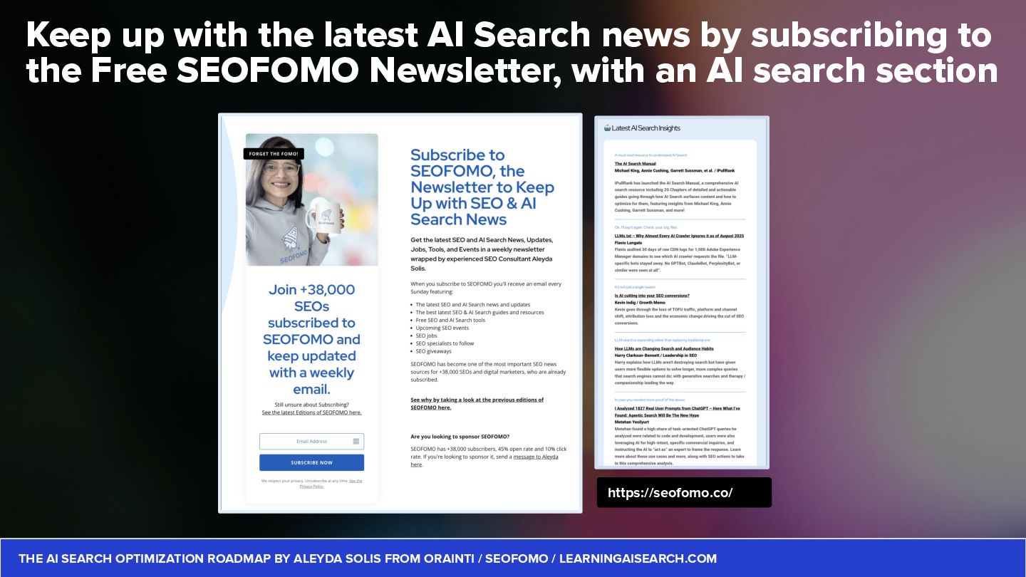to the Free SEOFOMO Newsletter, with an AI search section https://seofomo.co/ WINNING ECOMMERCE AI SEARCH BY ALEYDA SOLIS FROM ORAINTI / SEOFOMO / LEARNINGAISEARCH.COM THE AI SEARCH OPTIMIZATION ROADMAP BY ALEYDA SOLIS FROM ORAINTI / SEOFOMO / LEARNINGAISEARCH.COM