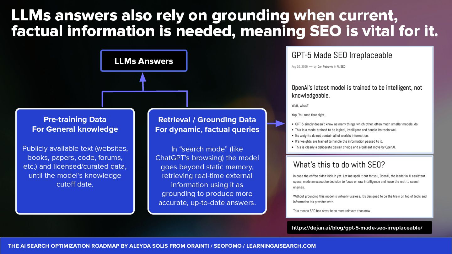 is needed, meaning SEO is vital for it. THE AI SEARCH OPTIMIZATION ROADMAP BY ALEYDA SOLIS FROM ORAINTI / SEOFOMO / LEARNINGAISEARCH.COM https://dejan.ai/blog/gpt-5-made-seo-irreplaceable/ LLMs Answers Retrieval / Grounding Data For dynamic, factual queries In “search mode” (like ChatGPT’s browsing) the model goes beyond static memory, retrieving real-time external information using it as grounding to produce more accurate, up-to-date answers. Pre-training Data For General knowledge Publicly available text (websites, books, papers, code, forums, etc.) and licensed/curated data, until the model’s knowledge cutoff date.