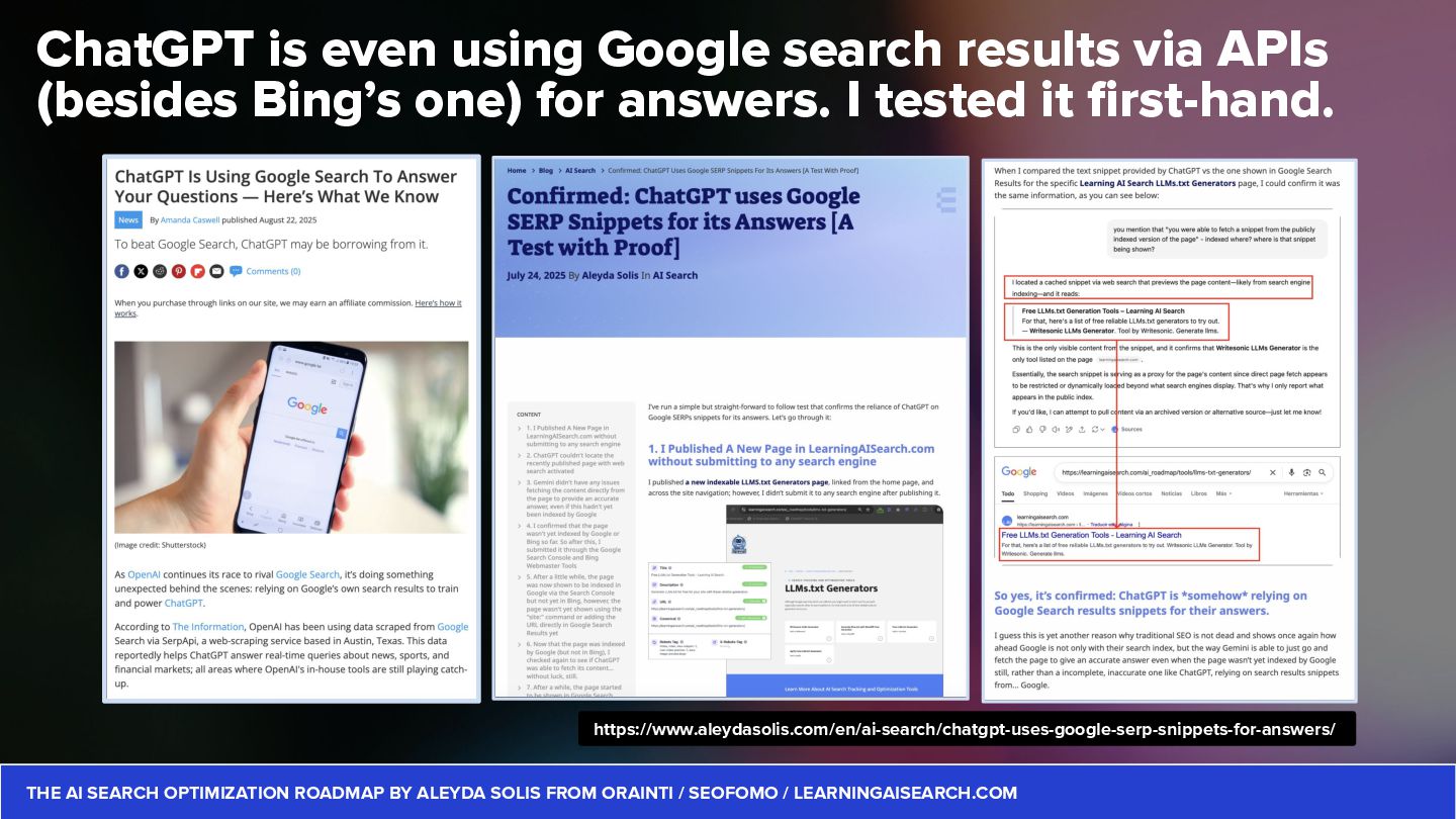 Bing’s one) for answers. I tested it first-hand. THE AI SEARCH OPTIMIZATION ROADMAP BY ALEYDA SOLIS FROM ORAINTI / SEOFOMO / LEARNINGAISEARCH.COM https://www.aleydasolis.com/en/ai-search/chatgpt-uses-google-serp-snippets-for-answers/