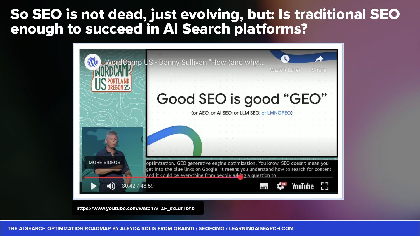 / SEOFOMO / LEARNINGAISEARCH.COM https://www.youtube.com/watch?v=ZF_sxLdfTbY& So SEO is not dead, just evolving, but: Is traditional SEO enough to succeed in AI Search platforms?