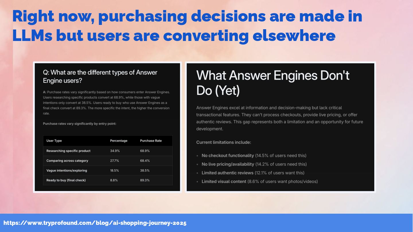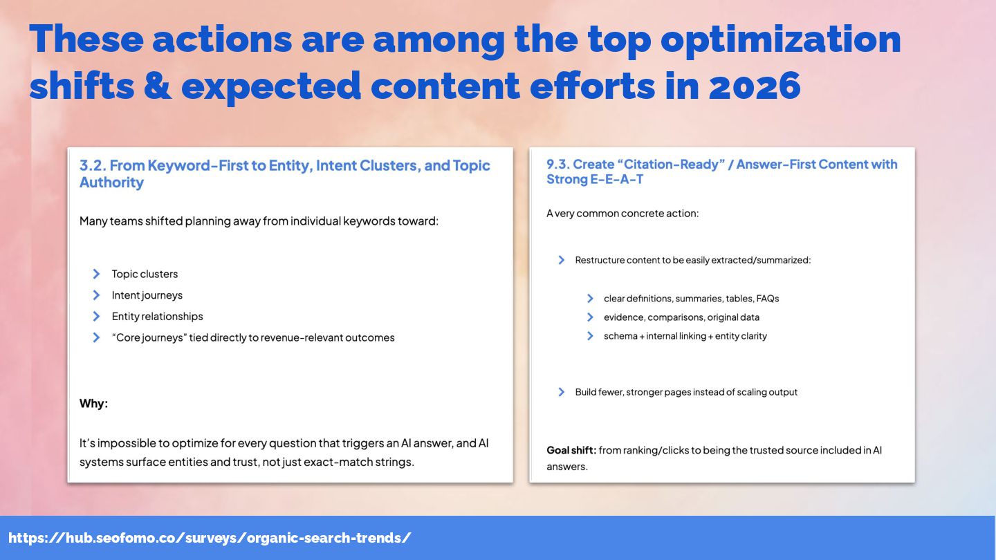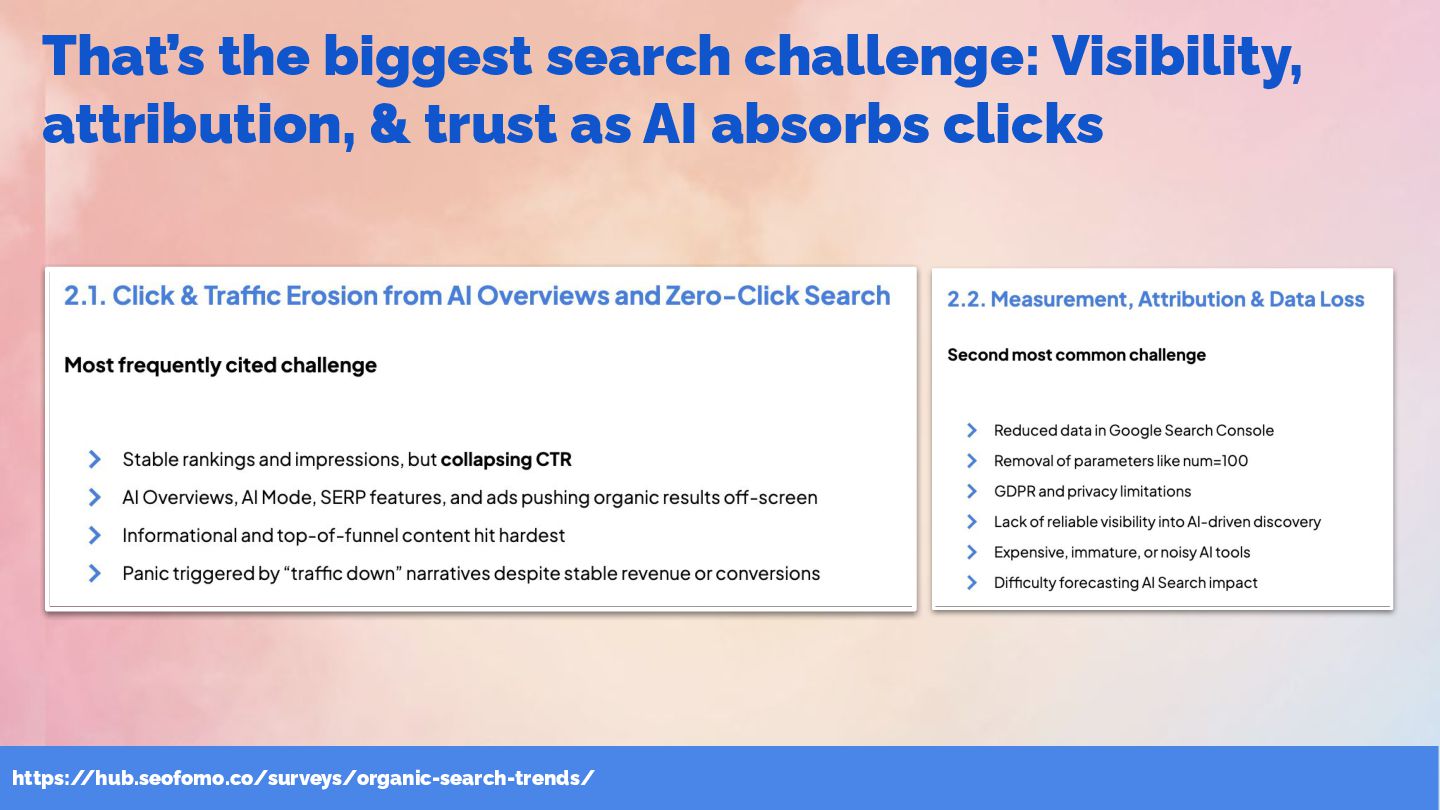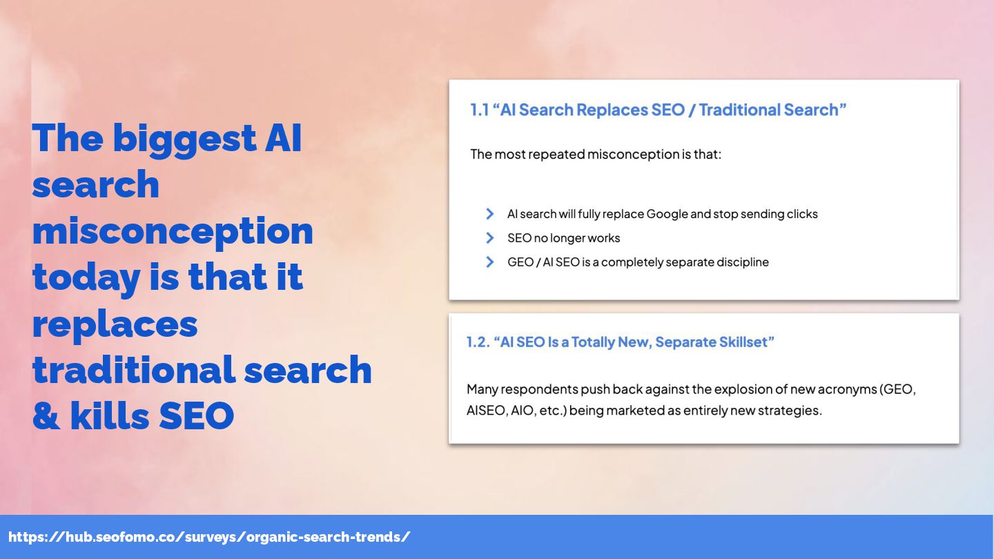 & SEOFOMO at #WTSFest Here are the immediate SEO implications from these key AI search shifts 1. AI search functions as both a performance and a branding channel. As user journeys increasingly complete inside AI answers, traffic alone is no longer a reliable indicator of success , making expanded KPIs and goals necessary. 2. You’re optimizing for comprehensive, well-structured content that AI can flexibly extract from any accessible page , rather than rigid query-to-page matching. 3. Building positive third-party citations is becoming as strategically important as earning relevant backlinks. Aligning SEO with digital PR and community management is now fundamental to shaping a consistent and credible brand presence