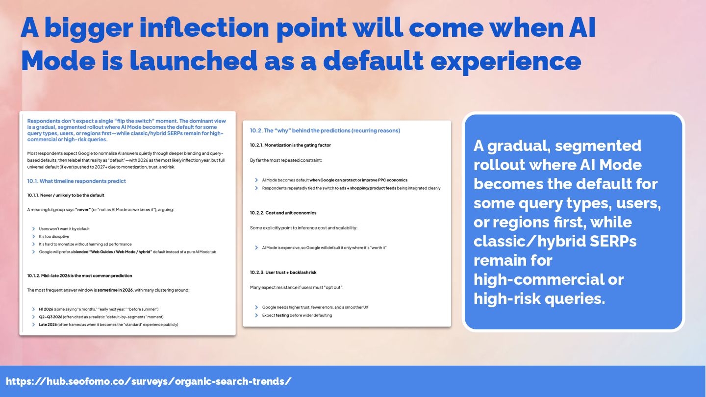 launched as a default experience https:/ /hub.seofomo.co/surveys/organic-search-trends/ A gradual, segmented rollout where AI Mode becomes the default for some query types, users, or regions first, while classic/hybrid SERPs remain for high-commercial or high-risk queries.