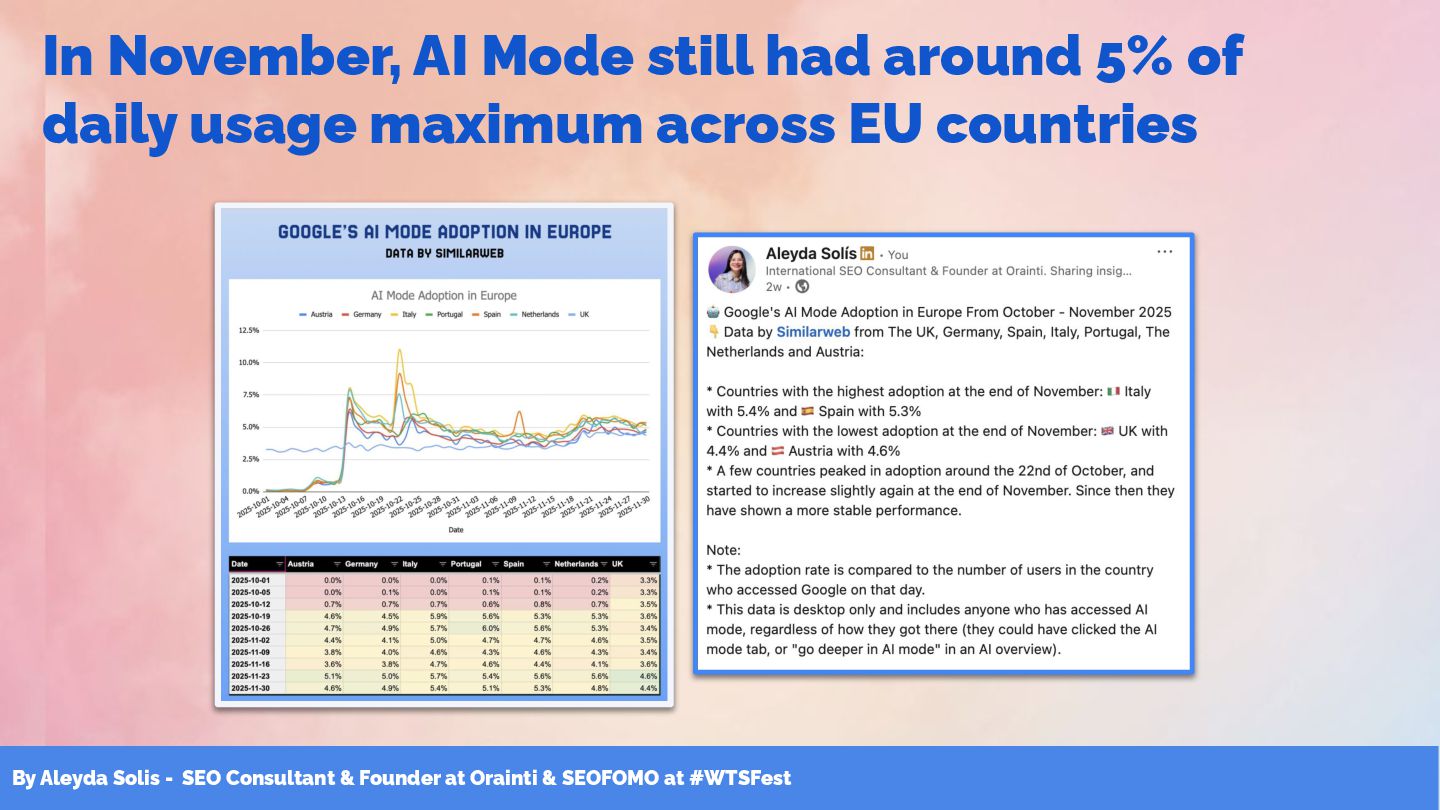 & SEOFOMO at #WTSFest In November, AI Mode still had around 5% of daily usage maximum across EU countries
