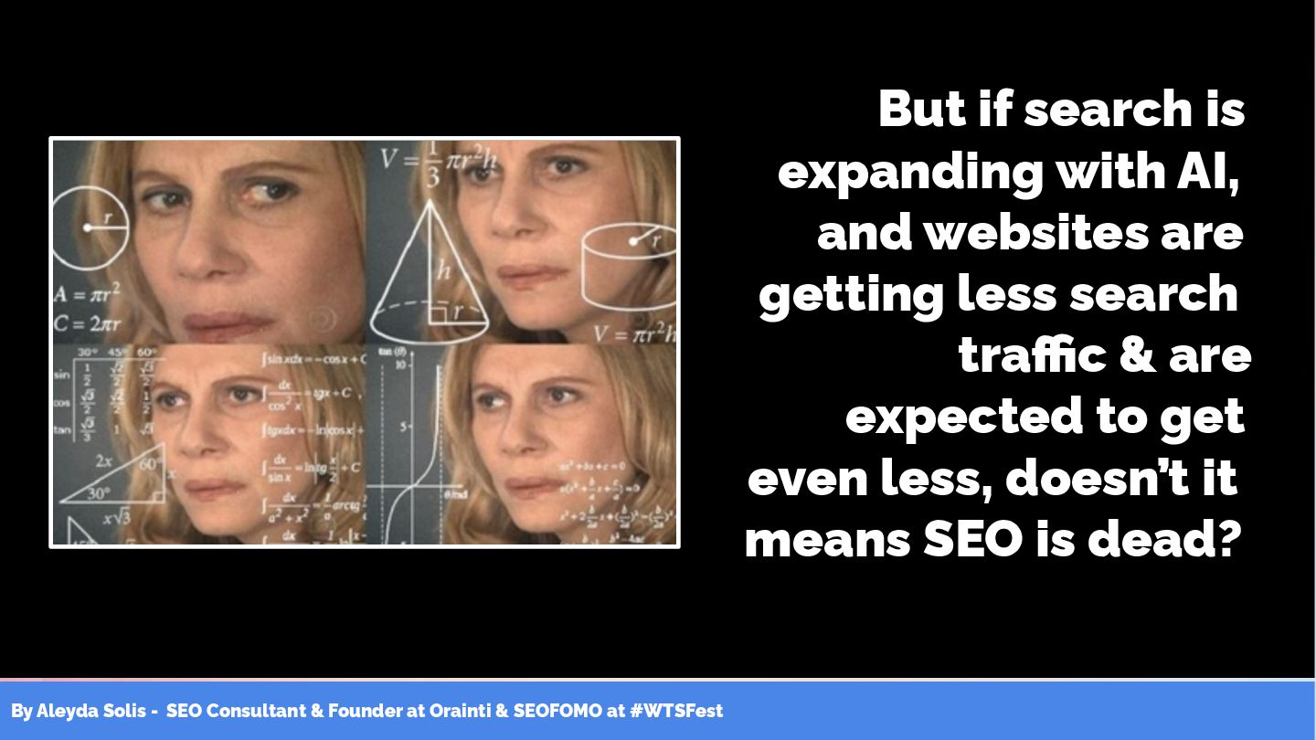 & SEOFOMO at #WTSFest But if search is expanding with AI, and websites are getting less search traffic & are expected to get even less, doesn’t it means SEO is dead?
