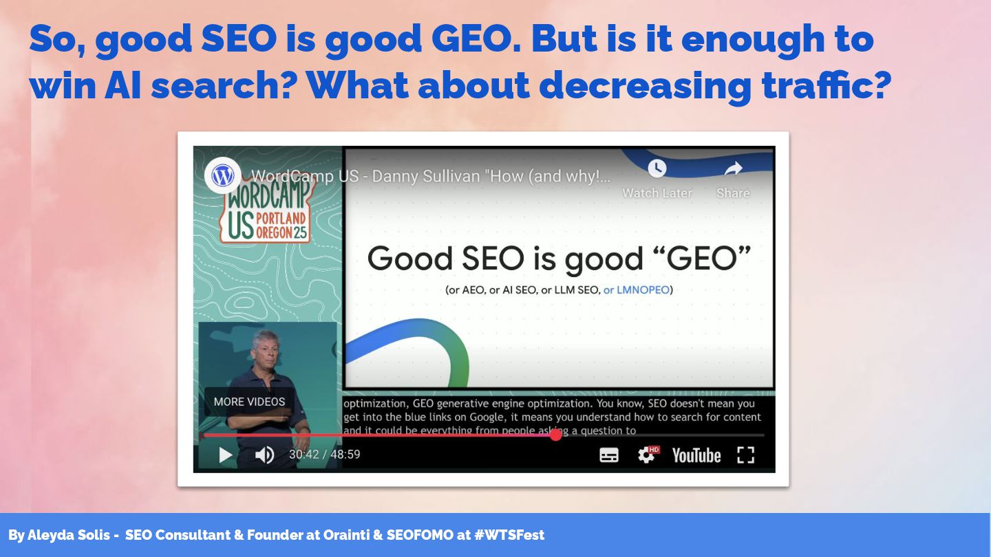 & SEOFOMO at #WTSFest So, good SEO is good GEO. But is it enough to win AI search? What about decreasing traffic?