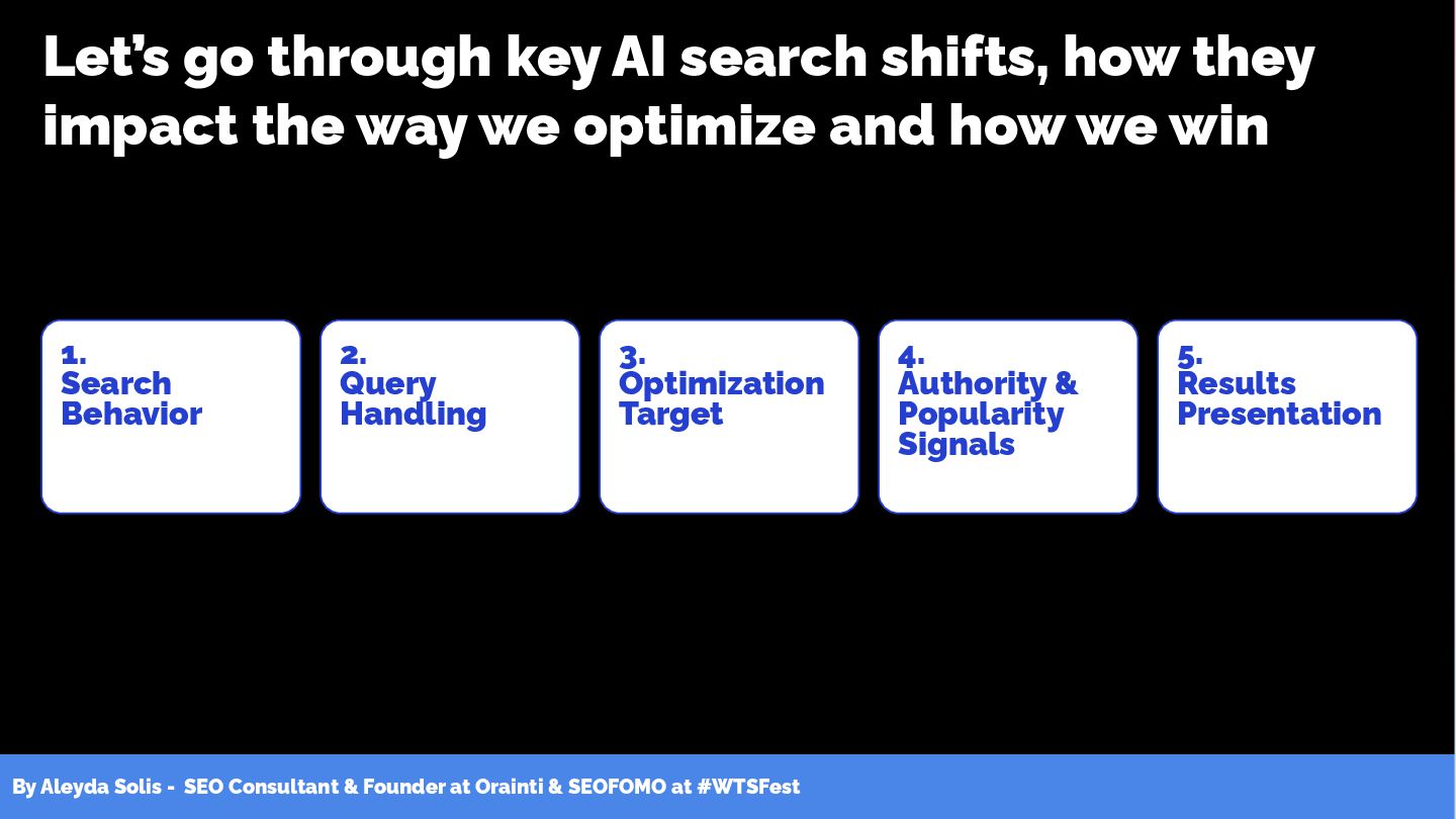 & SEOFOMO at #WTSFest 1. Search Behavior 2. Query Handling 3. Optimization Target 4. Authority & Popularity Signals 5. Results Presentation Let’s go through key AI search shifts, how they impact the way we optimize and how we win