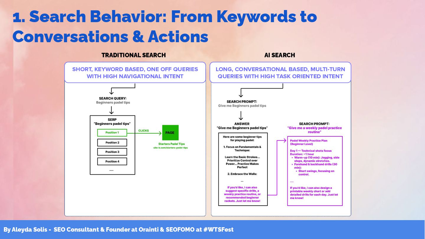 & SEOFOMO at #WTSFest 1. Search Behavior: From Keywords to Conversations & Actions SHORT, KEYWORD BASED, ONE OFF QUERIES WITH HIGH NAVIGATIONAL INTENT TRADITIONAL SEARCH LONG, CONVERSATIONAL BASED, MULTI-TURN QUERIES WITH HIGH TASK ORIENTED INTENT AI SEARCH