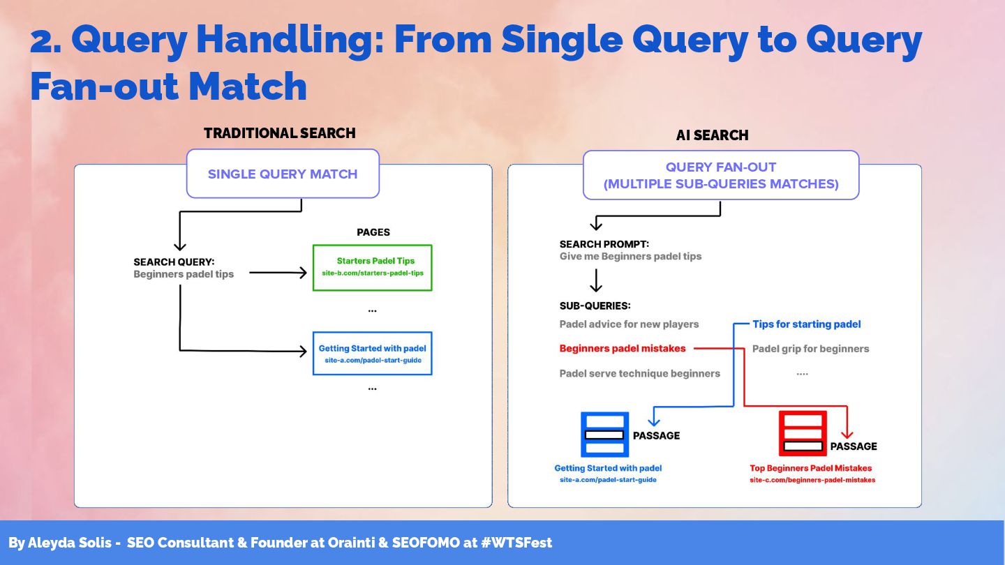 & SEOFOMO at #WTSFest 2. Query Handling: From Single Query to Query Fan-out Match SINGLE QUERY MATCH TRADITIONAL SEARCH AI SEARCH QUERY FAN-OUT (MULTIPLE SUB-QUERIES MATCHES)