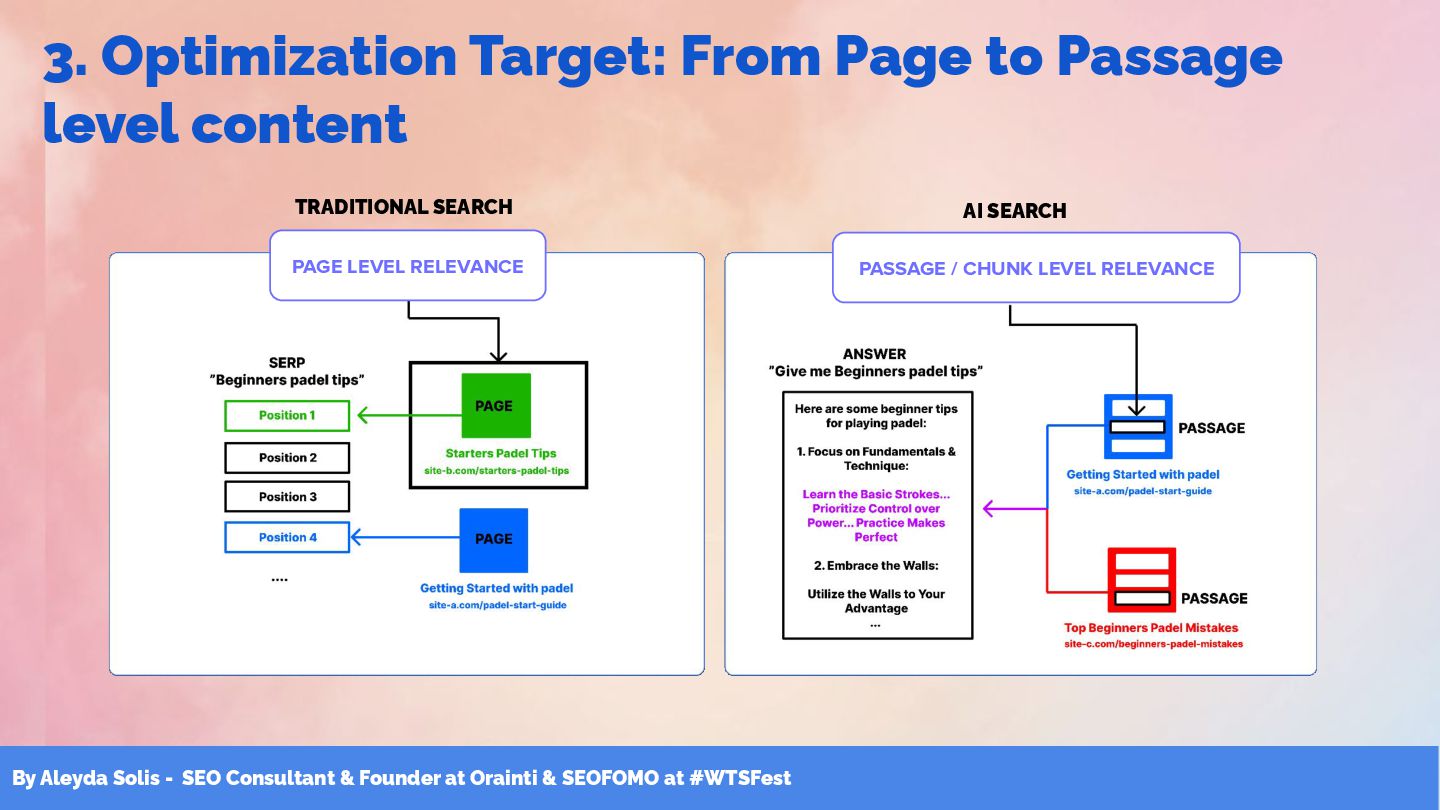 & SEOFOMO at #WTSFest 3. Optimization Target: From Page to Passage level content PAGE LEVEL RELEVANCE TRADITIONAL SEARCH PASSAGE / CHUNK LEVEL RELEVANCE AI SEARCH