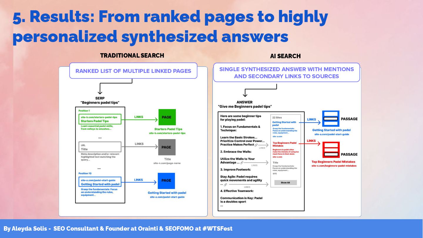 & SEOFOMO at #WTSFest 5. Results: From ranked pages to highly personalized synthesized answers RANKED LIST OF MULTIPLE LINKED PAGES TRADITIONAL SEARCH SINGLE SYNTHESIZED ANSWER WITH MENTIONS AND SECONDARY LINKS TO SOURCES AI SEARCH