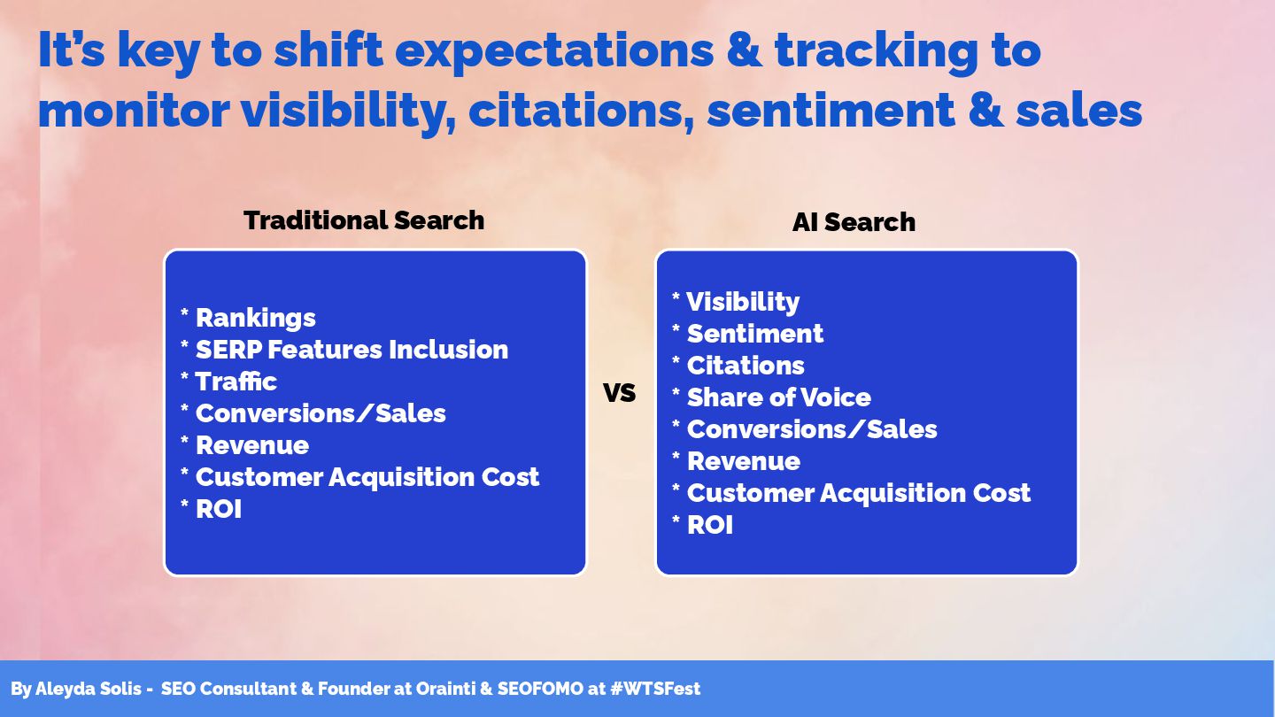 & SEOFOMO at #WTSFest * Rankings * SERP Features Inclusion * Traffic * Conversions/Sales * Revenue * Customer Acquisition Cost * ROI * Visibility * Sentiment * Citations * Share of Voice * Conversions/Sales * Revenue * Customer Acquisition Cost * ROI VS Traditional Search AI Search It’s key to shift expectations & tracking to monitor visibility, citations, sentiment & sales