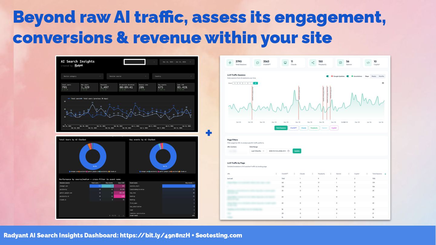 25. Radyant AI Search Insights Dashboard: https:/ /bit.ly/49n8nzH + Seotesting.com Beyond