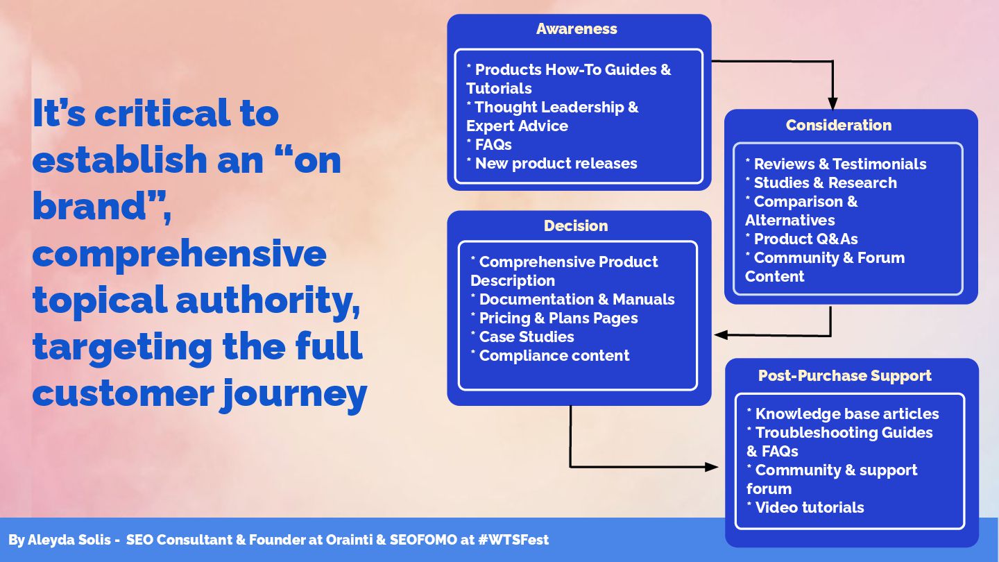 & SEOFOMO at #WTSFest It’s critical to establish an “on brand”, comprehensive topical authority, targeting the full customer journey Consideration * Reviews & Testimonials * Studies & Research * Comparison & Alternatives * Product Q&As * Community & Forum Content Decision * Comprehensive Product Description * Documentation & Manuals * Pricing & Plans Pages * Case Studies * Compliance content * Knowledge base articles * Troubleshooting Guides & FAQs * Community & support forum * Video tutorials Post-Purchase Support * Products How-To Guides & Tutorials * Thought Leadership & Expert Advice * FAQs * New product releases Awareness