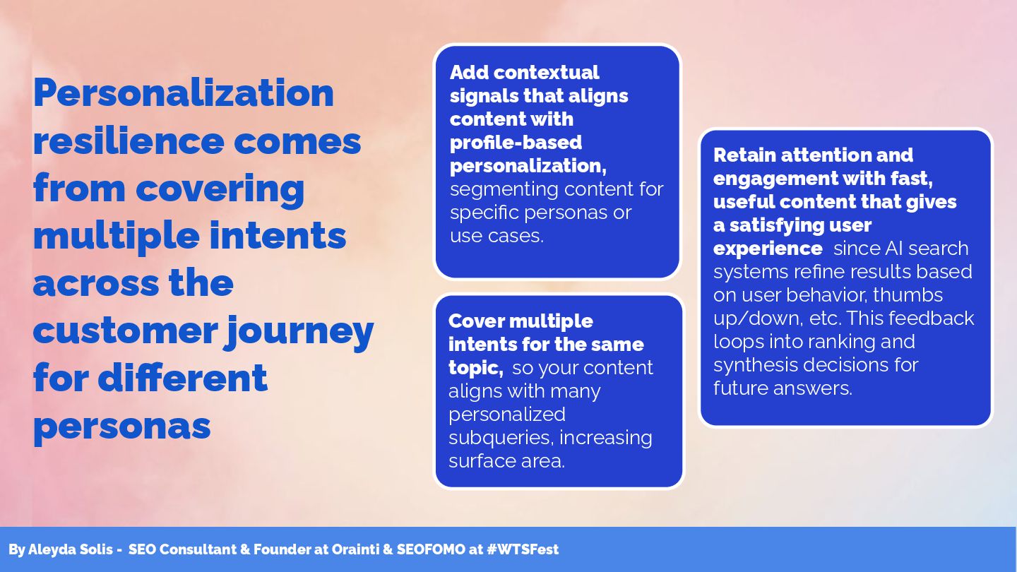 & SEOFOMO at #WTSFest Personalization resilience comes from covering multiple intents across the customer journey for different personas Cover multiple intents for the same topic, so your content aligns with many personalized subqueries, increasing surface area. Add contextual signals that aligns content with profile-based personalization, segmenting content for specific personas or use cases. Retain attention and engagement with fast, useful content that gives a satisfying user experience since AI search systems refine results based on user behavior, thumbs up/down, etc. This feedback loops into ranking and synthesis decisions for future answers.
